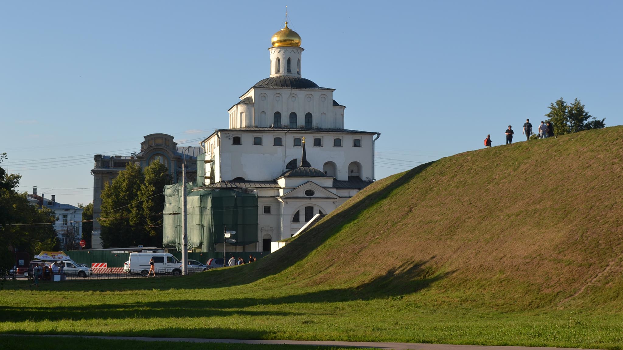 Вокруг собора — огромная смотровая площадка: 50-метровый крутой склон, под ним — современное продолжение города. Виды захватывают просторами, а еще можно представить, как замечательно отсюда когда-то просматривалось появление врага. Для защиты от которого, конечно, был построен кремль с пятью воротами. До нашего времени дожили только одни — Золотые (единственное укрепсооружение XII века, сохранившееся в России). Название напоминает, что створы когда-то были покрыты листами золоченой меди и ярко блестели на солнце. По легенде, в 1238 году, чтобы спасти ценные ворота от татарских орд, горожане сняли их и спрятали, а может, даже утопили в Клязьме. До сих пор ищут.