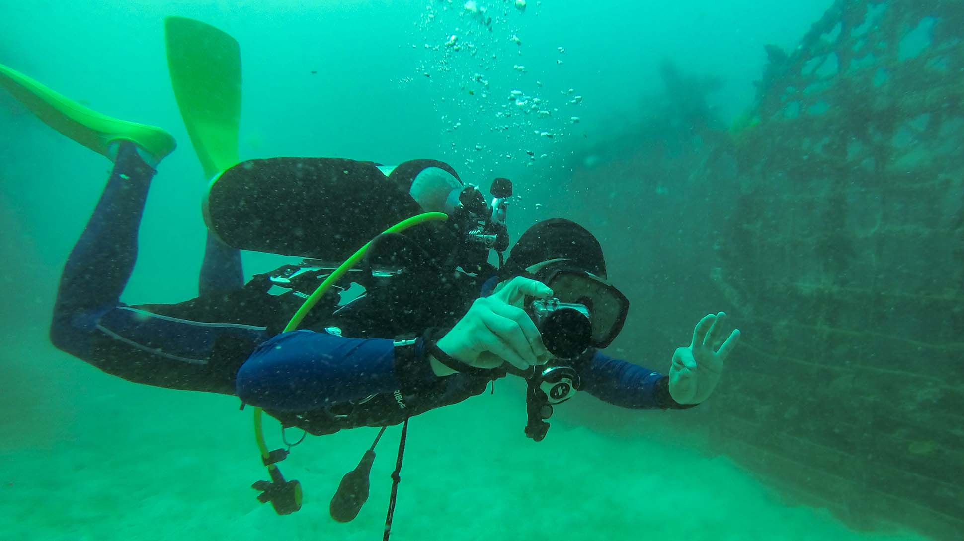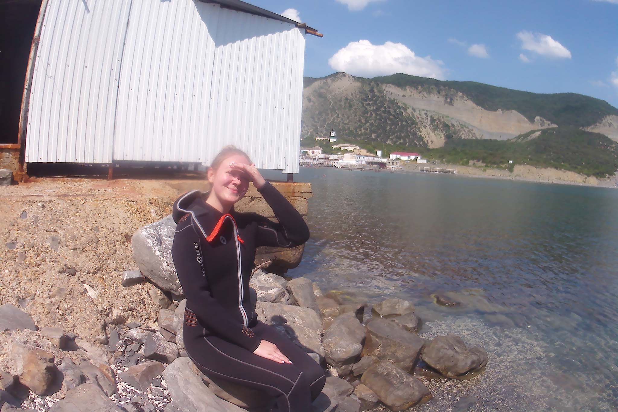 И он рассказал, как правильно дышать под водой, где у рюкзака с кислородным баллоном находятся клапаны, чтобы подниматься и опускаться, научил знакам, которыми общаются дайверы в море. За 15 минут уложились. И вот на меня трое мужчин натягивают гидрокостюм. Он настолько узкий, что пришлось немного попрыгать, чтобы его надеть. С ластами дело пошло быстрее.