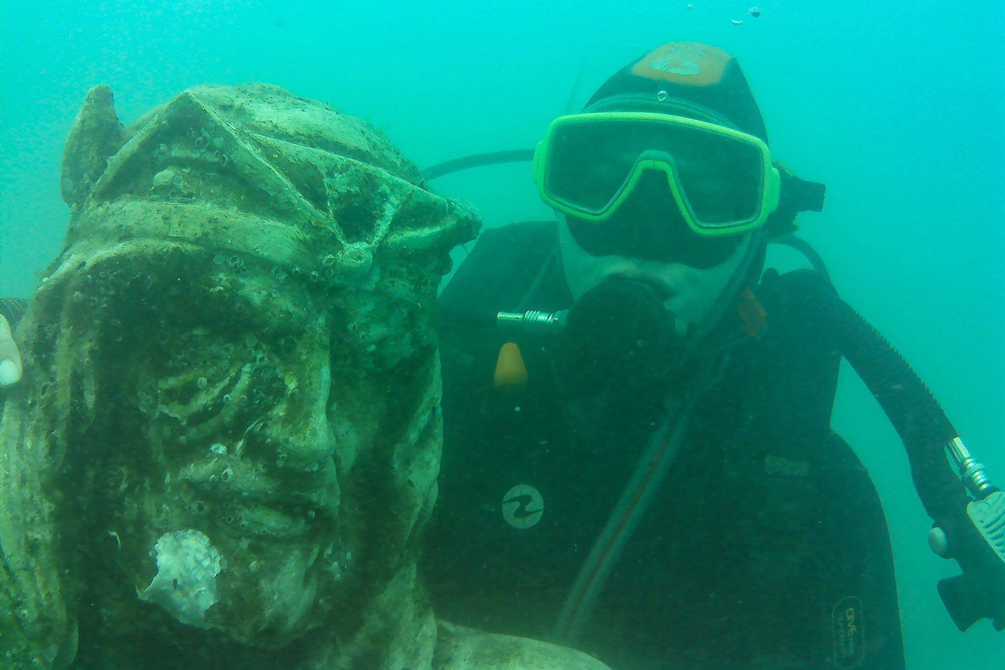 Сначала показались водоросли, мимо даже проплывали какие-то маленькие ящерицы, как потом мне объяснили, это была рыба-собака. А уже дальше началось самое интересное. Первыми в подводном музее меня поприветствовали… Владимир Ильич и Иосиф Виссарионович. Каменные головы Ленина и Сталина тут на самом входе в музей. Я чуть от неожиданности даже трубку изо рта не выронила!