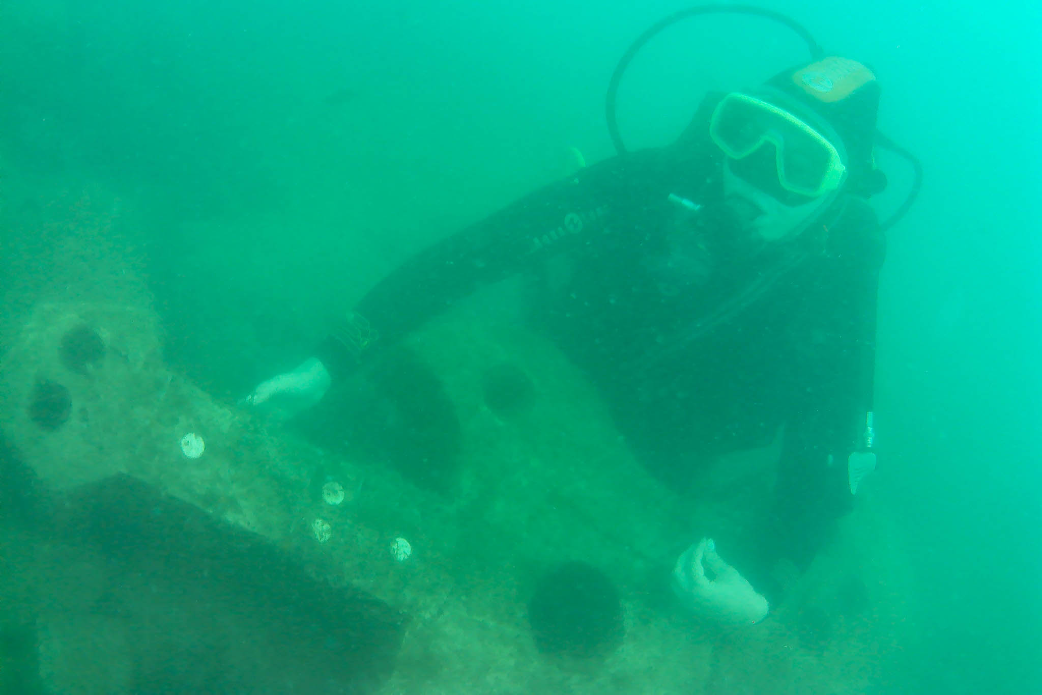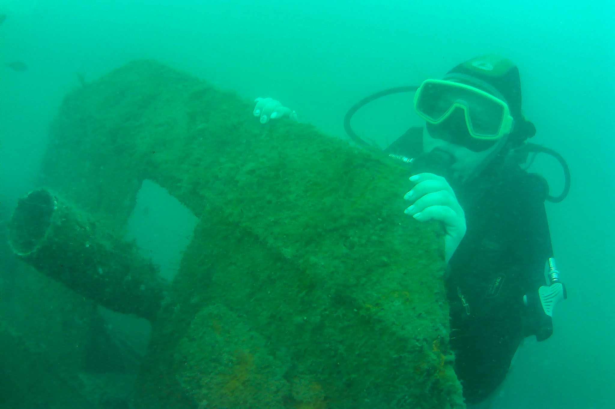Из экспонатов музея — остатки самолета ИЛ-2, немецкий военный мотоцикл. Особенно впечатлил затонувший корабль-баркас. Он лежит на глубине 12 метров. Только подплыла к нему, как навстречу мне выпорхнули сотни маленьких черных рыбок. А вот проплыл кисельный зонтик медузы — их здесь, кстати, много, но они не жалят. Инструктор знаком предложил мне взять в руки, я брезгливо отказалась. А сколько здесь крабов — их тоже решила не трогать.