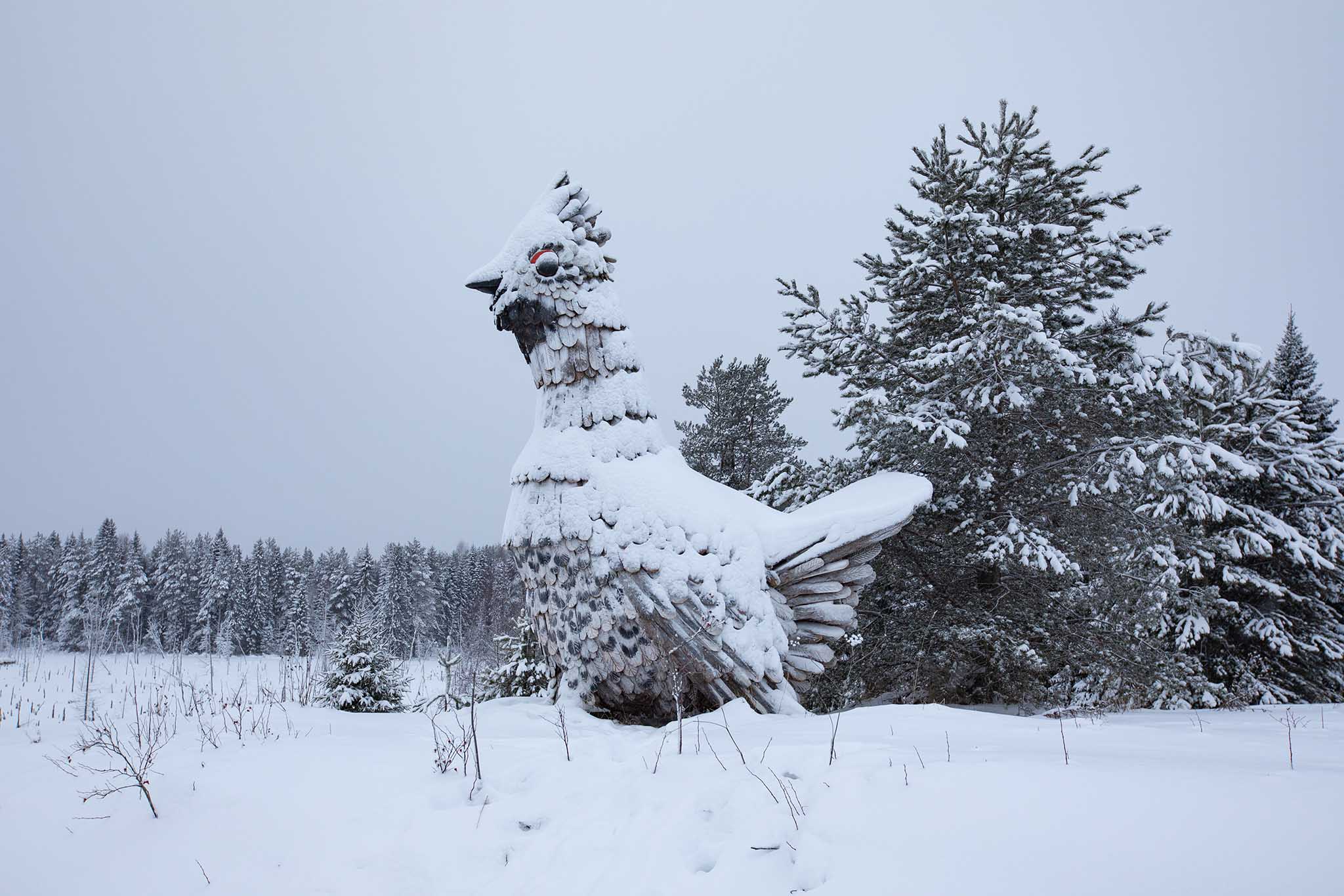 Узнавать Алену стали после масштабных работ. Пятиметрового хвоста кита, ныряющего прямо с неба в прибрежный песок, сделанного для фестиваля «Тайбола». Двух рябчиков, которые встречают у дороги любого въезжающего в Пинегу. Мы впечатлились, высота работ несколько метров. Арт-объект вошел в «Реестр рекордов России». Все из натуральных материалов: ивовых и березовых прутьев, отходов местного лесопильного производства.