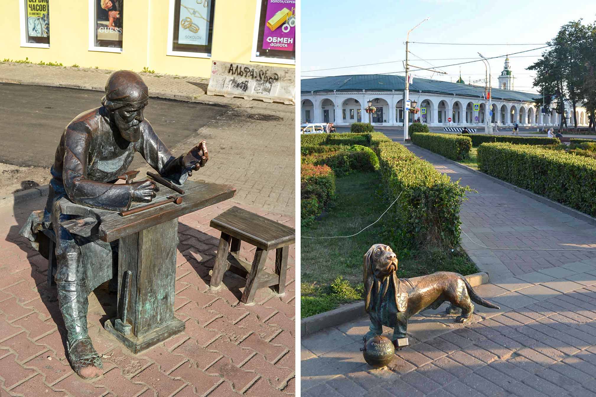 Пройдя от «Беседки Островского» по аллее вперед, выходим на главную улицу — Советскую. Тут недавно открыли еще одну туристическую достопримечательность — памятник ювелиру. Мастер держит в руке колечко. Считается, что надо просунуть в него палец и загадать желание — оно должно исполниться. А чуть дальше можно присесть рядом с восседающим на троне 4,5-метровым бронзовым Юрием Долгоруким — основателем Костромы.