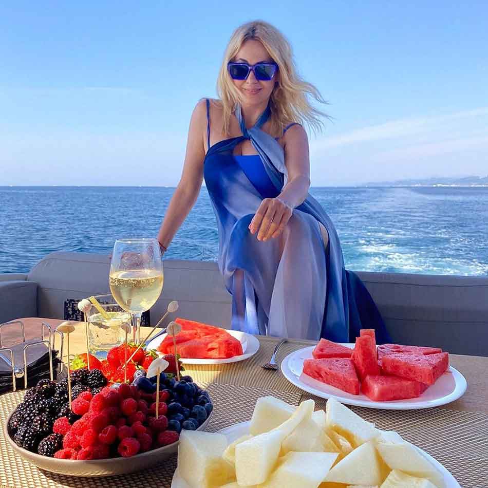 Пляжный отдых Рудковская сочетает с прогулками на яхте. «Провожаем с дельфинами закат», — написала она под одним из ярких кадров. Продюсер вместе с подругой, моделью Натальей Якимчик, смотрят вдаль, сидя на белоснежных диванах на палубе.