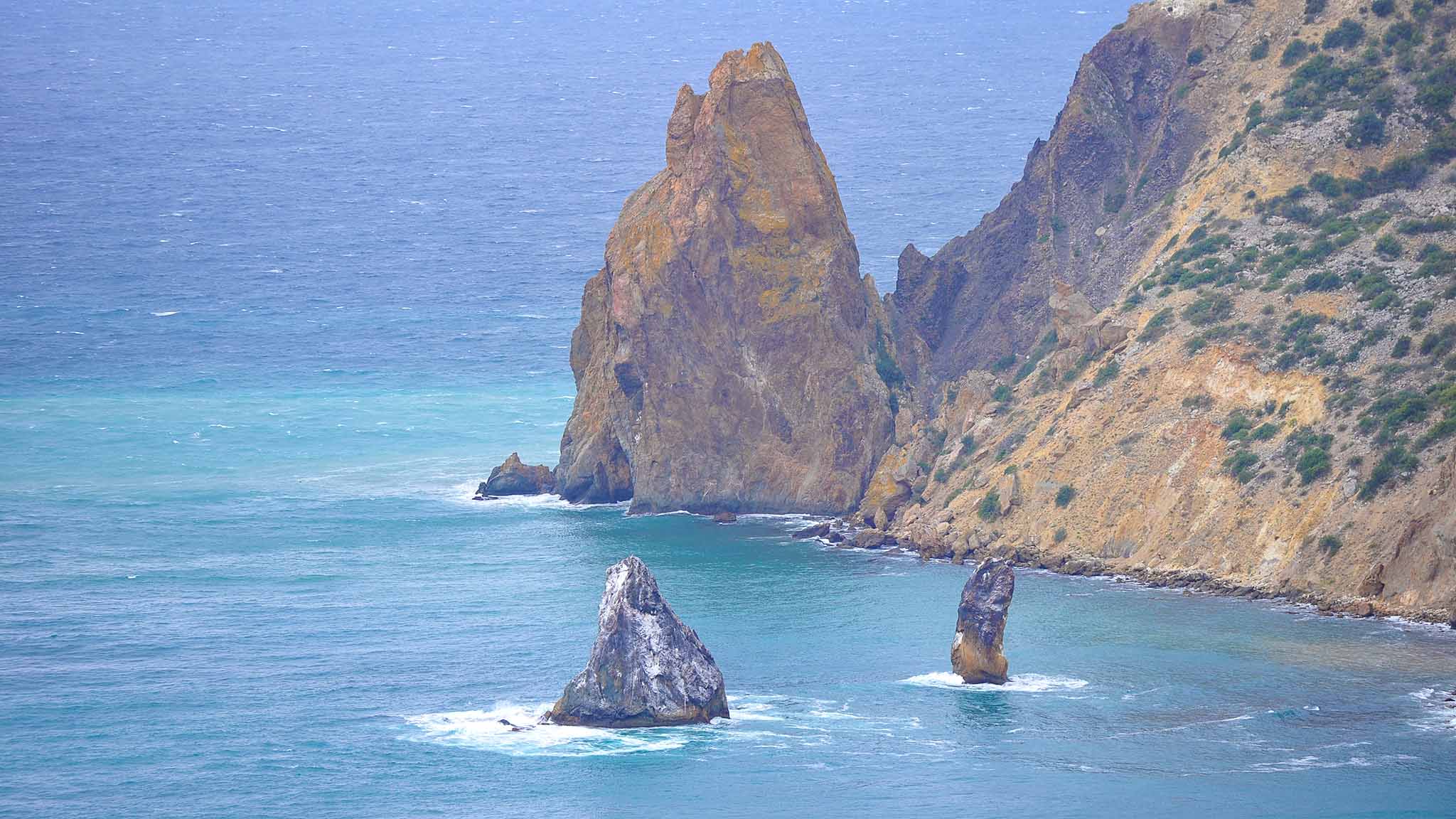 Мыс Фиолент в Севастополе красив не только на суше, но и под водой. Здесь есть пещеры, гроты и каменные свалы. При погружении велика вероятность обнаружить интересные находки. Недалеко от мыса Фиолент в море возвышаются две отдельно стоящие скалы — Орест и Пилат. Максимальная глубина у основания — 12 метров. В более крупной скале находится сквозной грот, через который можно проплыть. Глубины от 8 до 18 метров. Средняя глубина дайвинга — 12–16 метров.