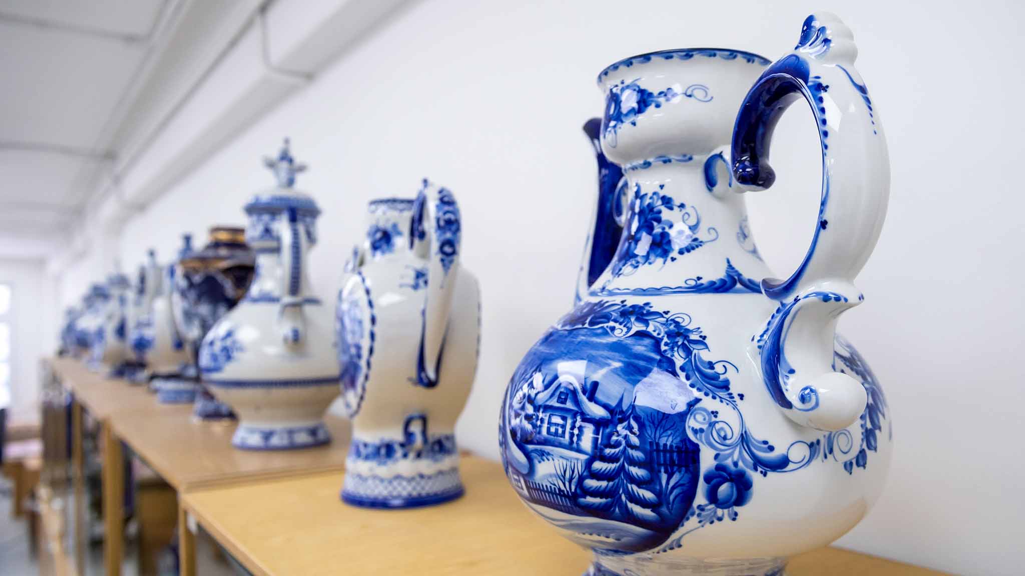 Смысл в том, что эта краска устойчива к высоким температурам. Смотрим: вот разрисованные чашки и подносы, еще розовые, как младенцы, окунают в жидкое стеклообразное покрытие — глазурь. Упс! «Младенцы» вдруг стали белыми, как тот снег на поле возле станции. Рисунок будто спрятался. В таком состоянии произведения мастеров отправляют на очередной обжиг. И после этого происходит чудо: глазурь становится блестящей и под ней проступает синий рисунок.