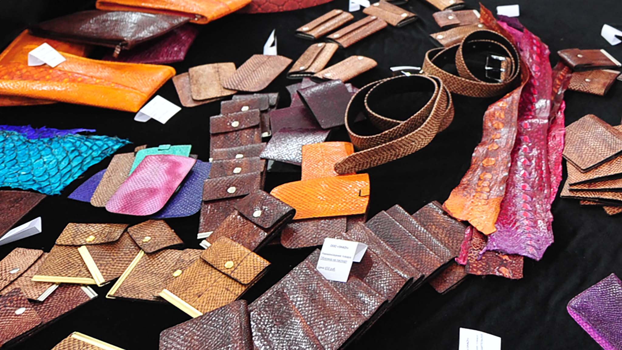 Кошелек из рыбьей кожи. На фабрике в Назрани изготавливают качественные вещи из кожи кальмара, осетра, лосося и карпа. Здесь продают сумки, обувь, куртки, ключницы, брелоки, портмоне и кошельки. Небольшие вещицы стоят от 200 руб., а картины из рыбьей кожи — 10 000–25 000 руб.