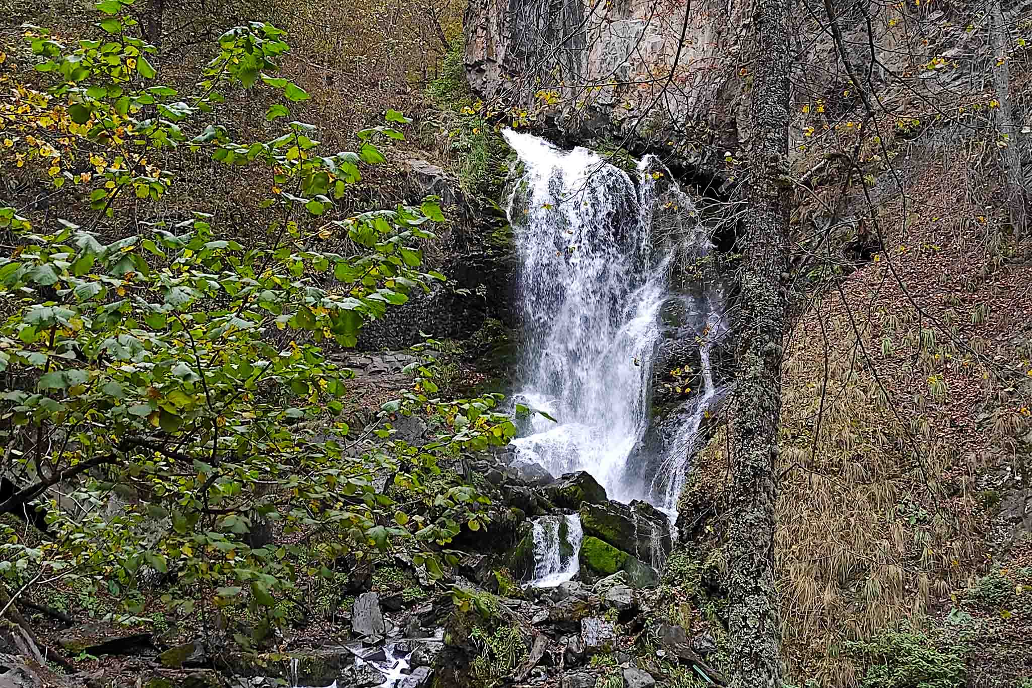 Особенно красив водопад в солнечную погоду, когда из-за мелких брызг появляется радуга. В чистом ручье водится речная форель. Тропа к водопаду проложена по живописному ущелью. Она идет мимо сосен, орешника, лиственных деревьев и зарослей можжевельника.