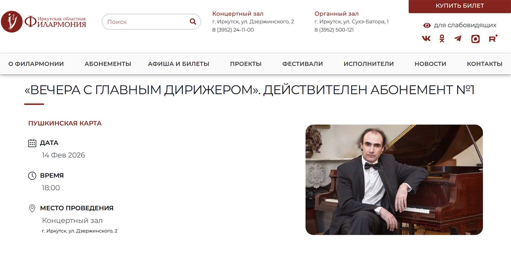 Еще одна идея для свидания – концерт фортепианной музыки. Иркутская областная филармония предлагает посетить «Вечера с главным дирижером». В программе — произведения Петра Чайковского и Николая Римского-Корсакова. А исполнят их Губернаторский симфонический оркестр под руководством главного дирижера Ильи Дербилова и солист из Санкт-Петербурга — заслуженный артист России Олег Вайнштейн, участник многих престижных музыкальных фестивалей, выступает с концертами не только в России, но по всему миру.