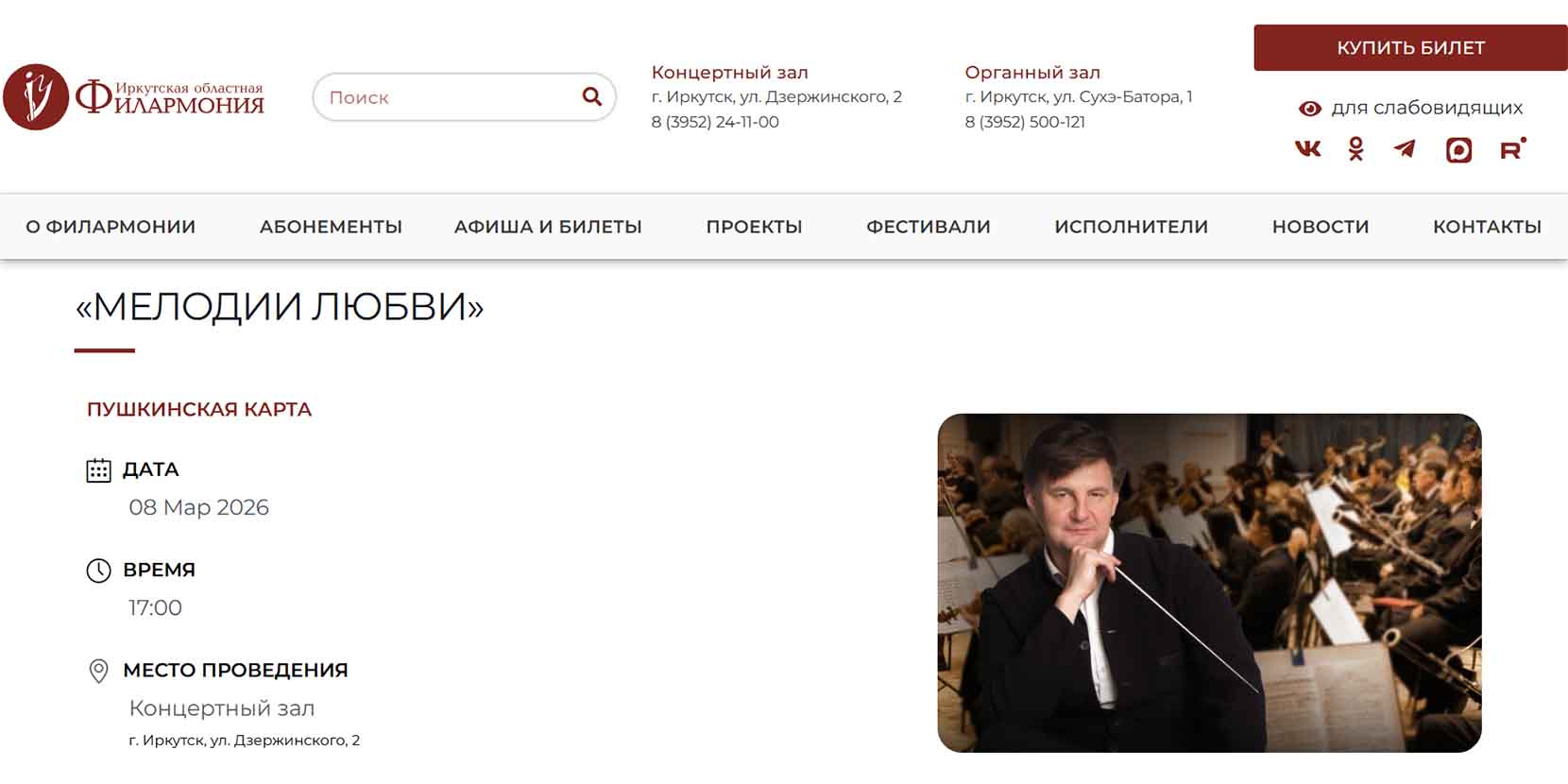 И выбор у иркутян есть — концерты в Органном зале, в филармонии, интересные спектакли, новаторские постановки, которые заставят и посмеяться, и о многом подумать, а еще уникальные масштабные выставки со всеми видами и жанрами изобразительного искусства. И не забывайте про гастроли известных звезд! Выбирайте, куда сходить 8 марта в Иркутске 2026.