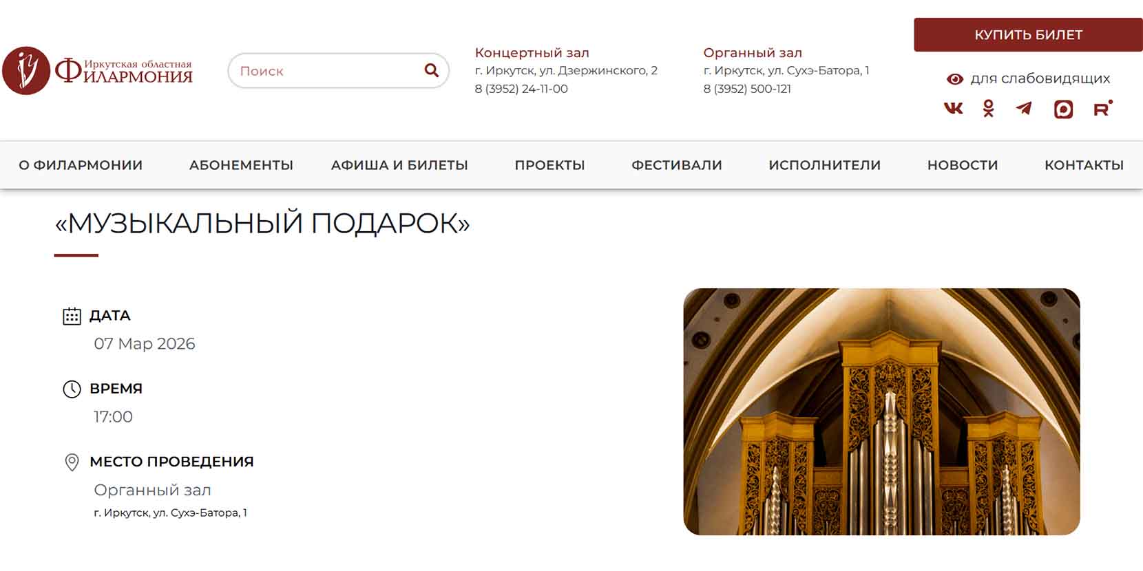 И выбор у иркутян есть — концерты в Органном зале, в филармонии, интересные спектакли, новаторские постановки, которые заставят и посмеяться, и о многом подумать, а еще уникальные масштабные выставки со всеми видами и жанрами изобразительного искусства. И не забывайте про гастроли известных звезд! Выбирайте, куда сходить 8 марта в Иркутске 2026.