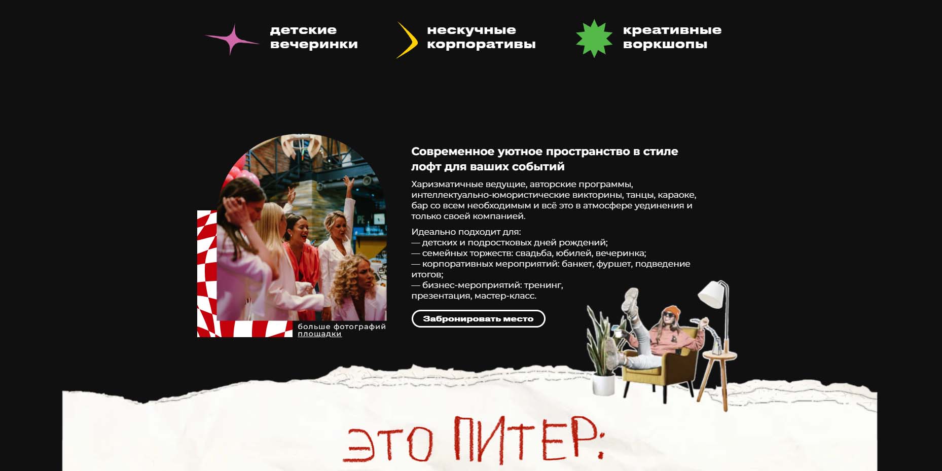 Двухъярусное лофт-пространство подойдет для детских и подростковых вечеринок. Если нужно время на подготовку — например, оформить стены плакатами или развесить шарики — дается бесплатный час. В каждом углу есть по фотозоне, в баре все необходимое: посуда, чайники, холодильник, микроволновка. Можно выбрать авторские развлекательные программы, юмористические викторины и другие варианты развлечений. Помогут на празднике бармен и диджей. До и после мероприятия организаторы проведут клининг.