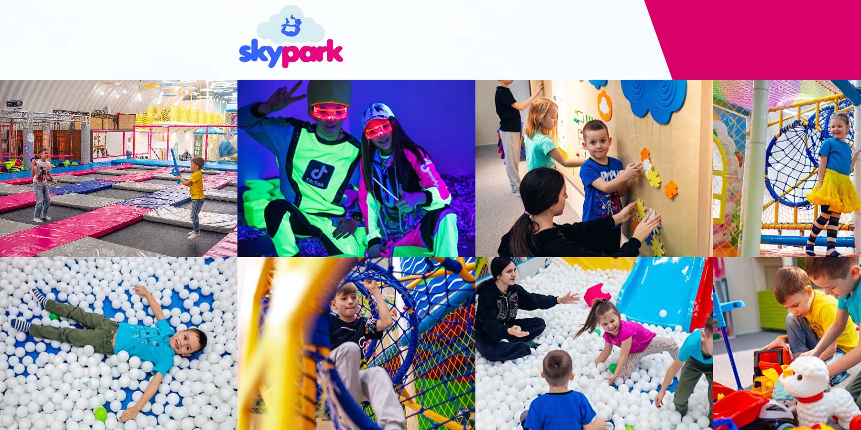 Спортивный парк предлагает массу «улетных» развлечений: батуты, поролоновые ямы, скалодромы, полосу препятствий и баскетбол на батутах. Для проведения мероприятий выделена лаунж-зона. Ко дню рождения можно воспользоваться одним из праздничных пакетных предложений для детей. При этом сопровождающие взрослые проходят бесплатно. При большом количестве гостей имеет смысл воспользоваться услугами ведущего. Один из пакетных планов предлагает аниматоров на выбор. Реквизит, костюмы и оборудование гостям предоставят. Важно взять с собой подходящую спортивную одежду и полотенце.