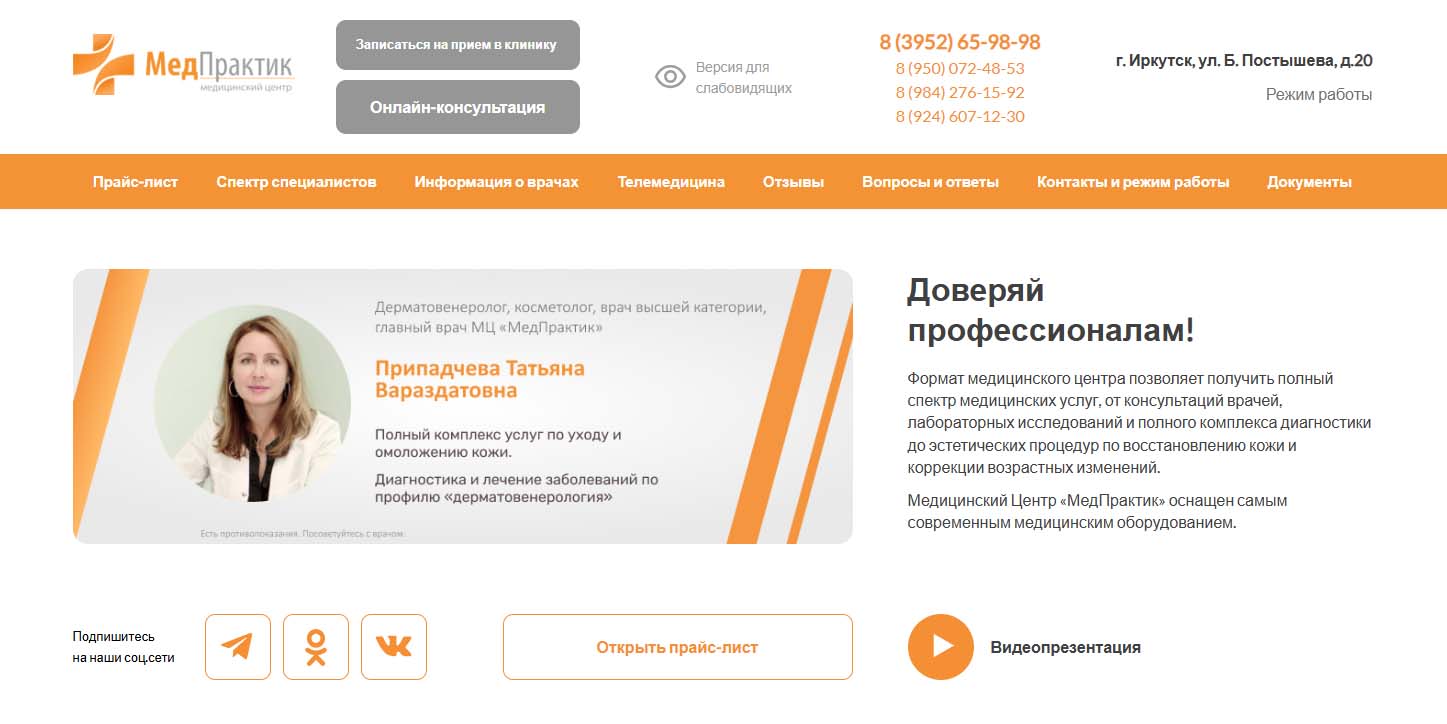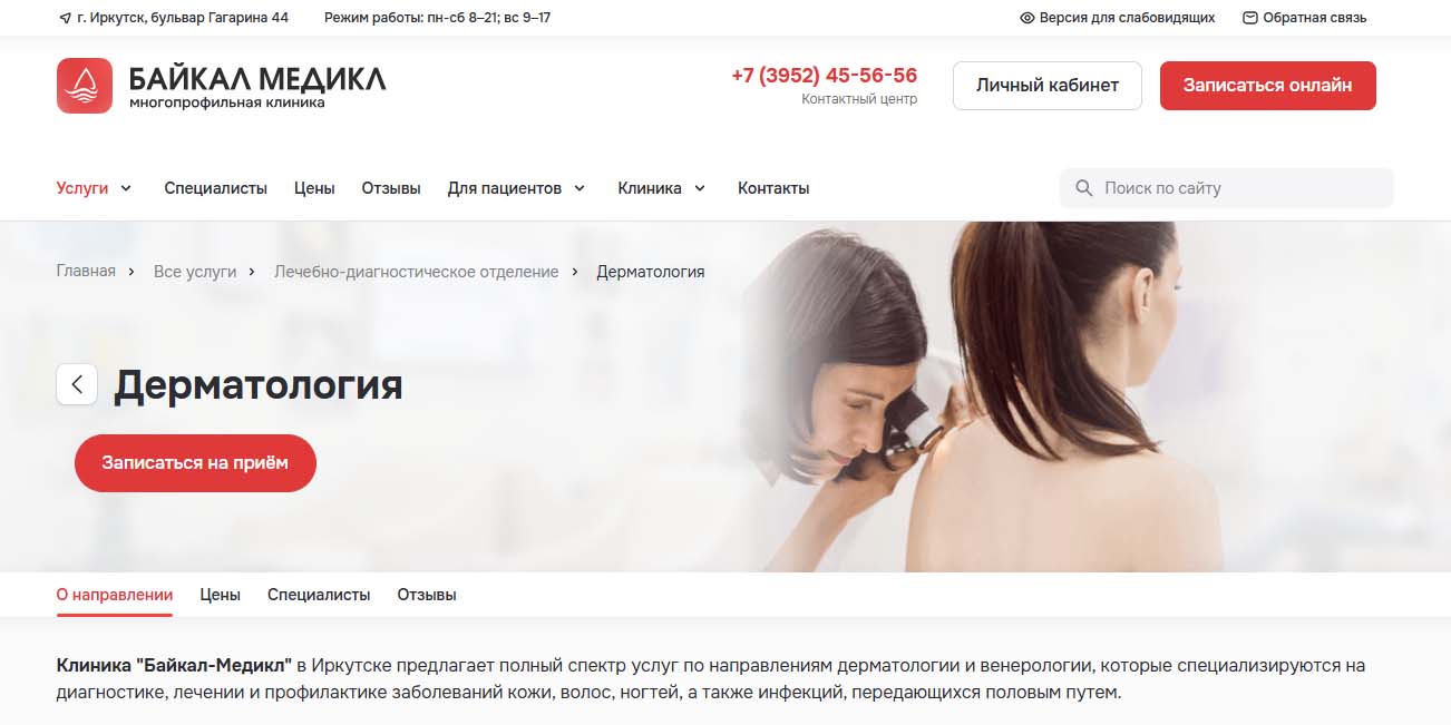 В Иркутске не так много специализированных кожных клиник. Обычно кабинеты дерматологии открываются в многопрофильных медцентрах. Некоторые больницы ограничиваются базовым осмотром пациента и общей консультацией. Другие предлагают более широкий спектр услуг и современные методы лечения. Пациентов принимают узкие специалисты — трихологи, косметологи, онкологи, венерологи.