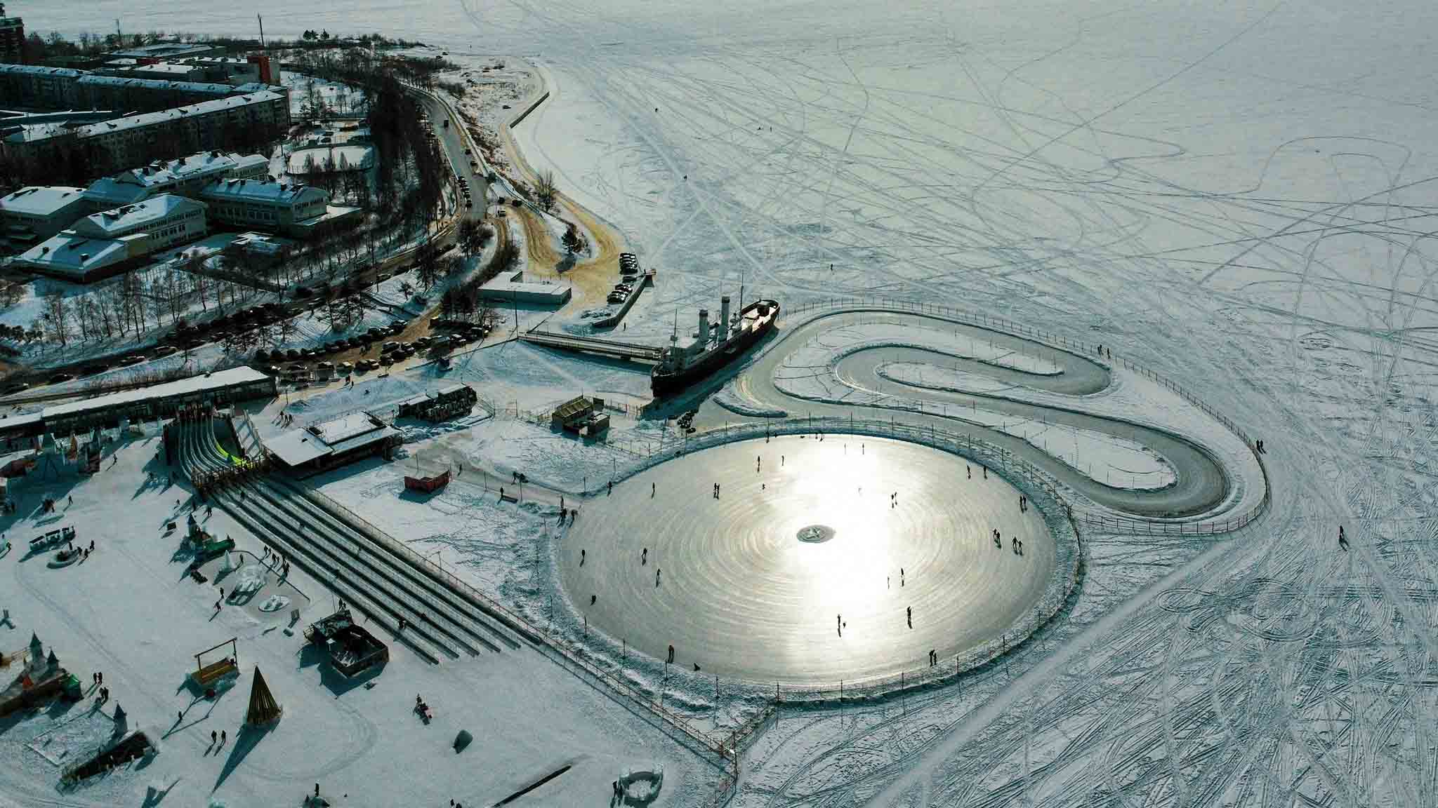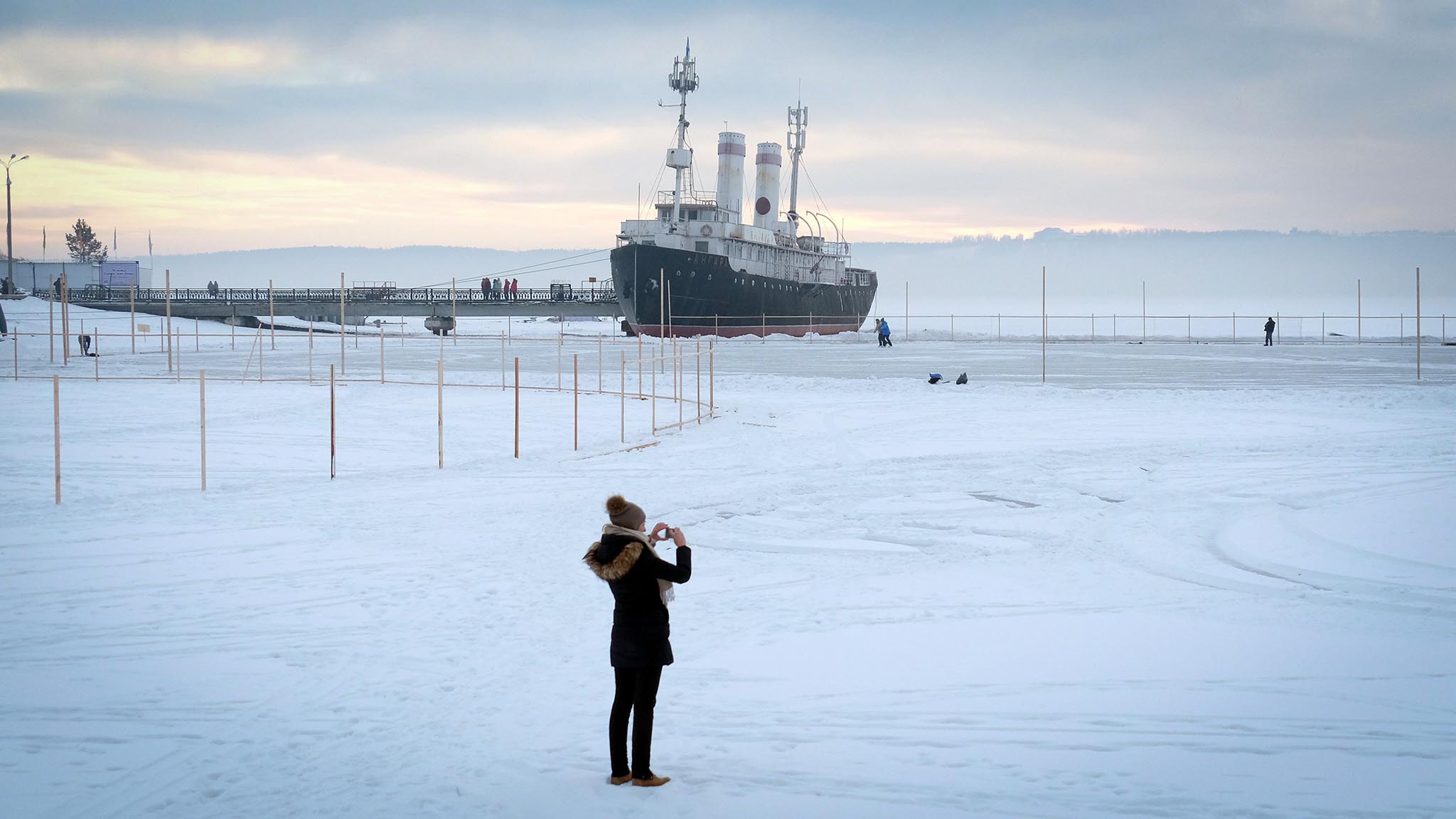 Зато зимой рядом с пароходом строят ледовый городок с яркими гирляндами и различными — маленькими и большими — виражными горками для ледянок, а на льду Иркутского водохранилища оборудуют каток.