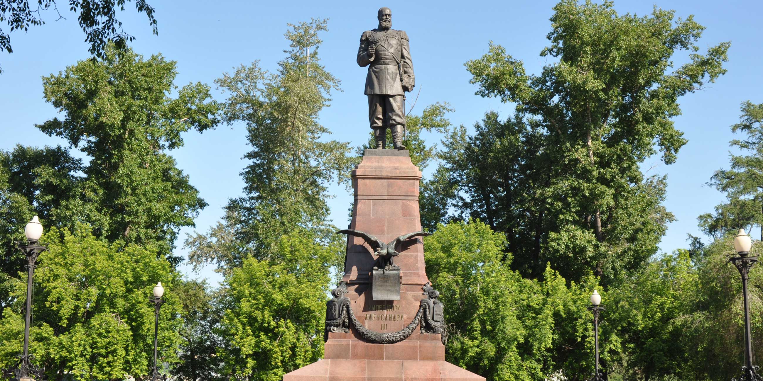 Рядом – памятник императору Александру III. В 1908 году купцы пожертвовали деньги на его строительство в честь завершения строительства Транссиба.