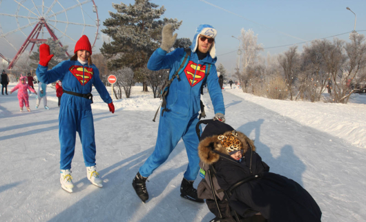Большой каток на острове Конный заливают к новогодним праздникам. Площадь его превышает 4,5 тысяч квадратных метров. Работает каток до февраля. Есть пункт проката коньков.