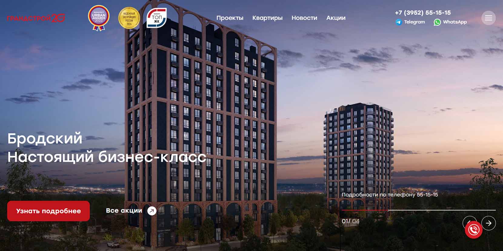 Строительная компания основана в 2005 году, специализируется на разработке и строительстве крупномасштабных жилых проектов. Сейчас строит ЖК «Бродский». Это квартиры в доме бизнес-класса с панорамными окнами, недалеко от центра города и с видом на Ангару. Сдача в 2027 году. Из плюсов — набережная в шаговой доступности, неподалеку есть горнолыжный комплекс и круглогодичный парк развлечений, все необходимые социальные объекта. Также после сдачи ЖК «СОЮЗ PRIORITY» (Союз Приорити) застройщик запустил новый проект «Союз Priority MAX» (Союз Приорити Макс) в микрорайоне Университетский. Здесь первые дома будут готовы в 2029-м. Обещается жилье бизнес-класса с теплым подземным паркингом и уютным закрытым двором.