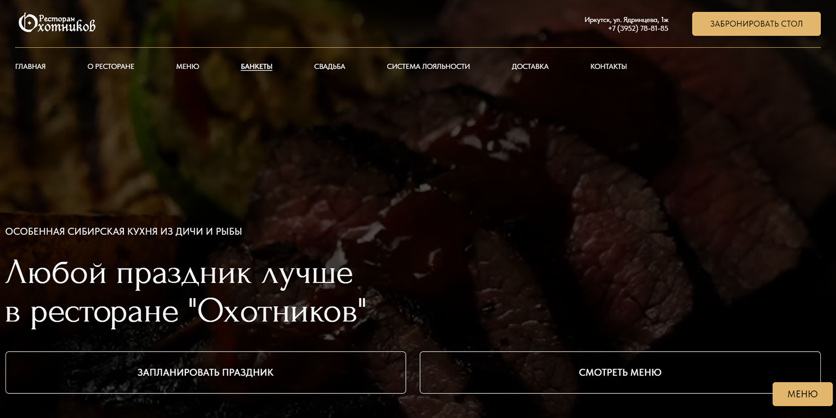 «Охотников» специализируется на экзотических блюдах из дикого мяса. Отсюда и название. Однако в меню много привычных блюд и закусок из европейской и русской кухни. В Новый год «Охотников» готовит своим гостям не только праздничный ужин, но и развлекательную программу — живой вокал, выступление артистов, дискотеку и отличное настроение от ведущего вечера.