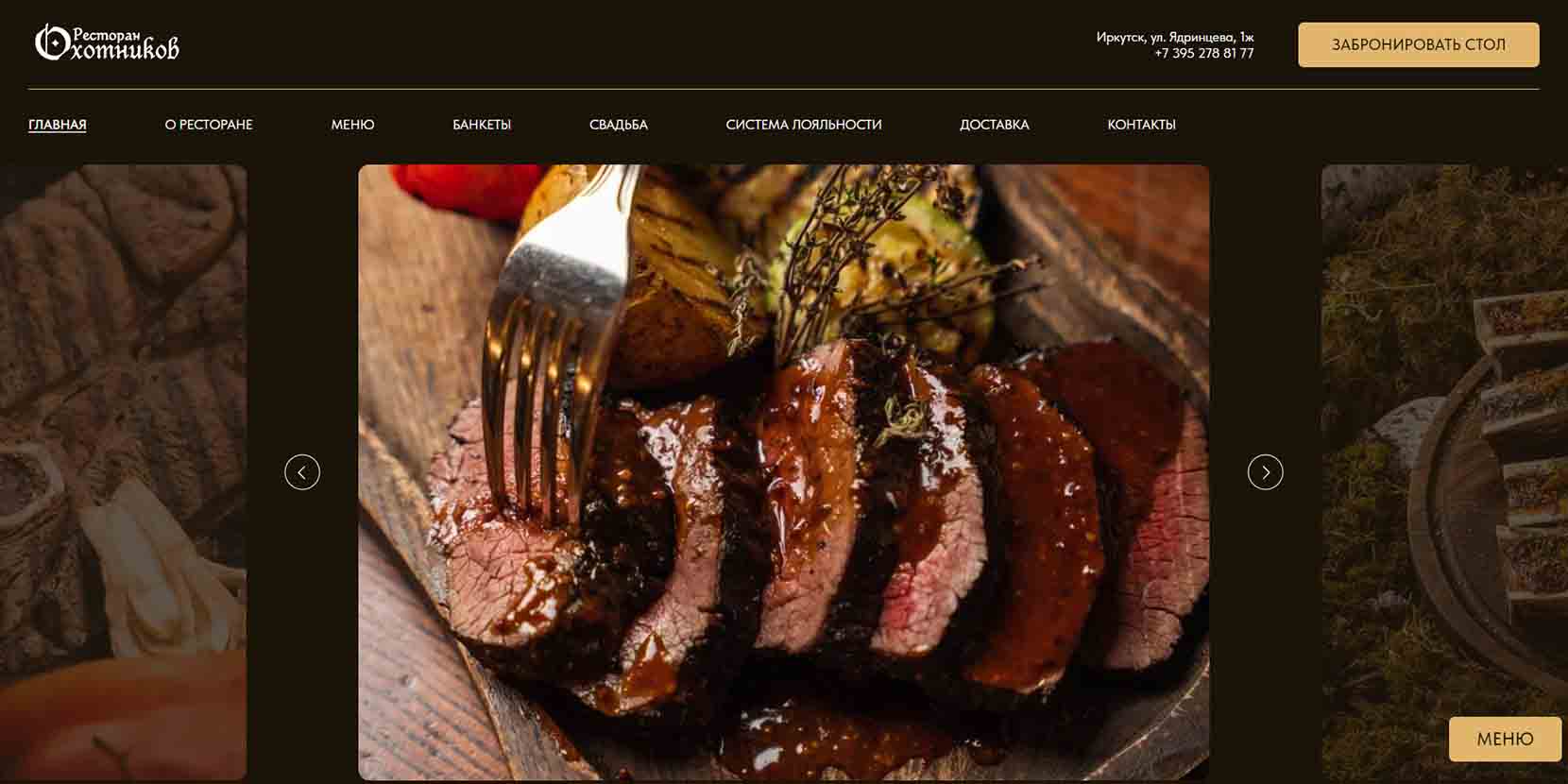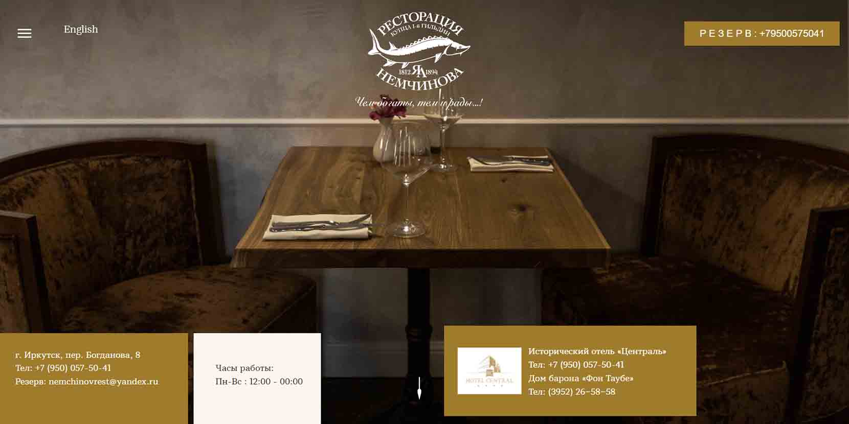 Ресторан удивляет блюдами из сибирских рыб и дикого мяса, разными таежными деликатесами — строганина, зельц, бухлер, кундюмы. Визитная карточка заведения — каре косули. Охотничий колорит прослеживается и в интерьере — массивная мебель из натурального дерева, декоративные детали, текстиль. Со среды по субботу звучит живой вокал. Можно заказать доставку из ресторана или отметить праздник в банкетном зале заведения.