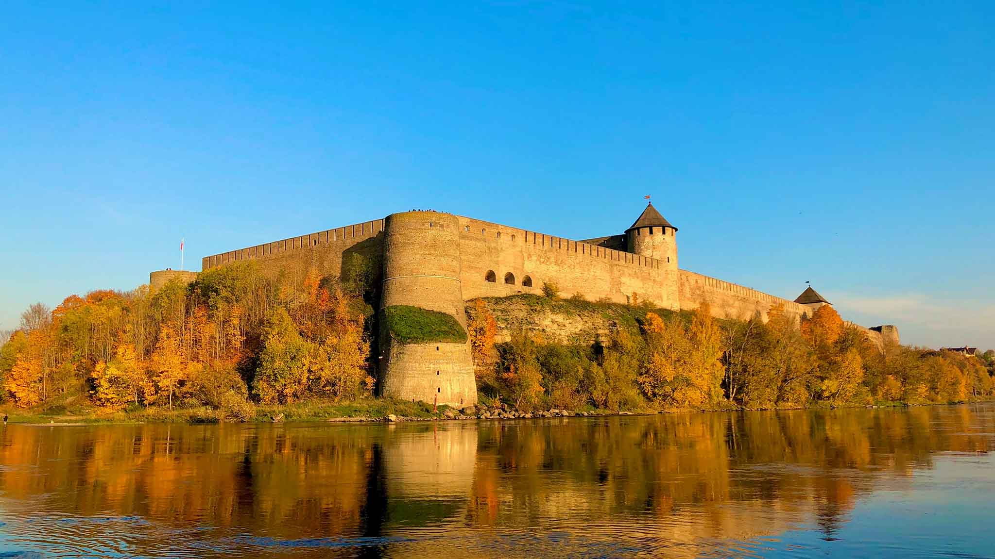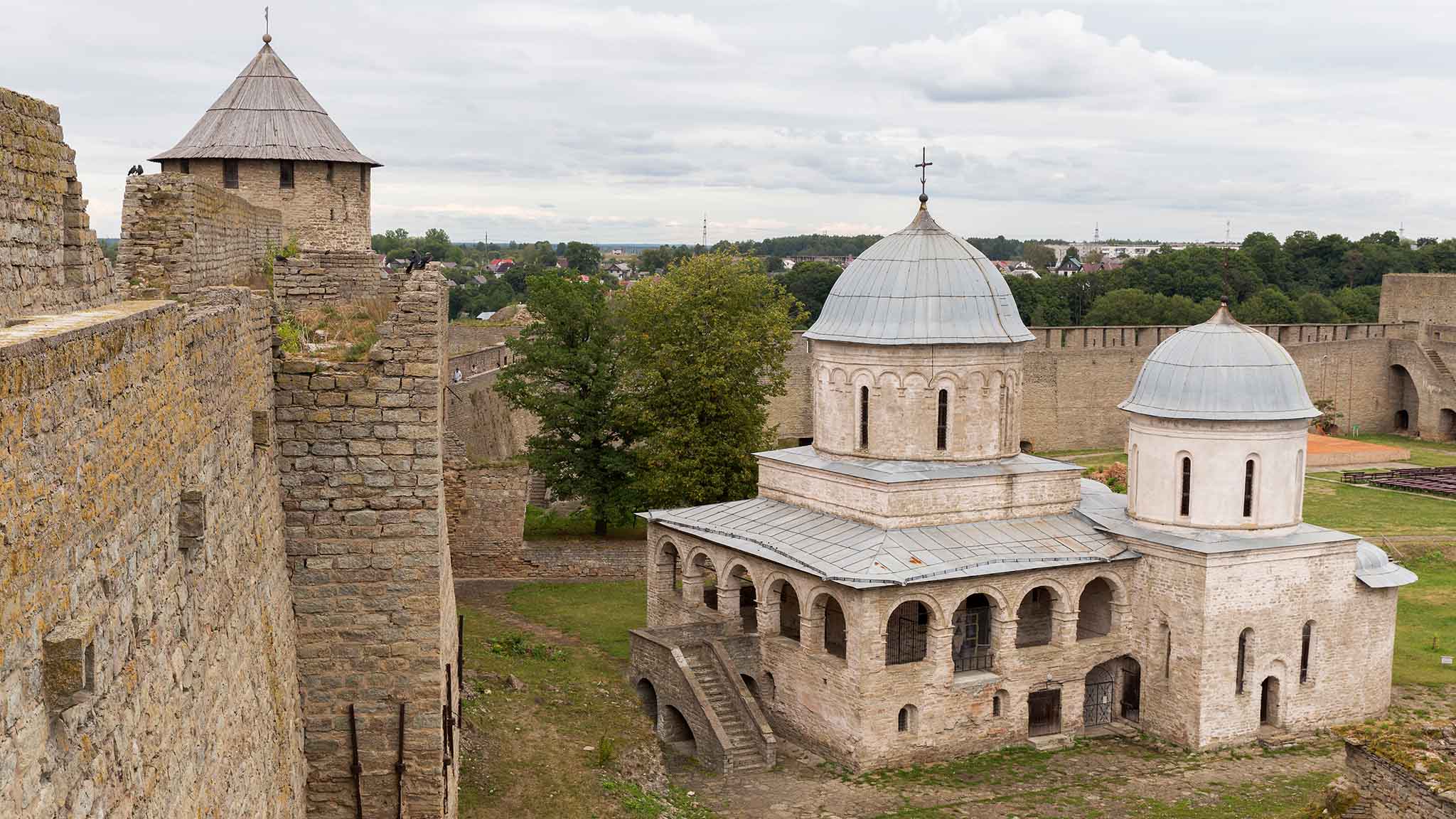 Обязательно прогуляйтесь по территории крепости, полюбуйтесь старинным сооружением, каменной кладкой, архитектурными решениями. Вся площадь укреплений занимает около 8 гектаров. Стены соединяют 11 башен. Высота самой большой — Воротной — 24 метра. Высота стен крепости в среднем около 15 метров, а самая большая достигает 25-30 метров. Здесь разрешают самостоятельно бродить почти по всем башням и стенам. С них открываются живописные виды на реку, эстонский берег и Нарвскую крепость.