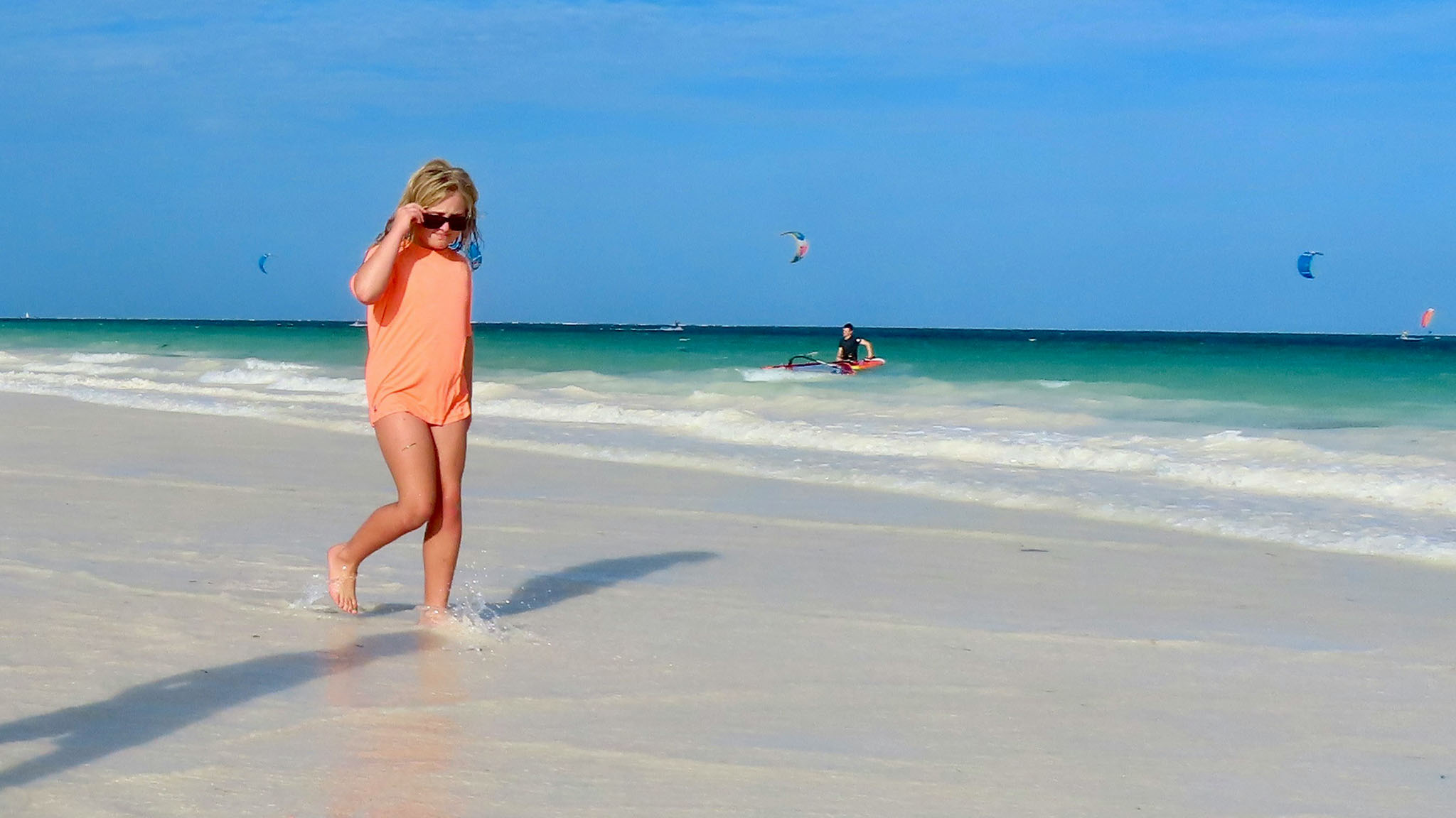 Чистый пляж с прозрачной водой даже в сильный ветер. Здесь безопасно купаться с маленькими детьми, потому что мелко даже в 50 метрах от берега. Работают кафе и есть аттракционы («банан», «таблетка», гидроцикл). По отзывам туристов, тут не бывает шторма и море всегда тихое. Открыта платная парковка перед пляжем.