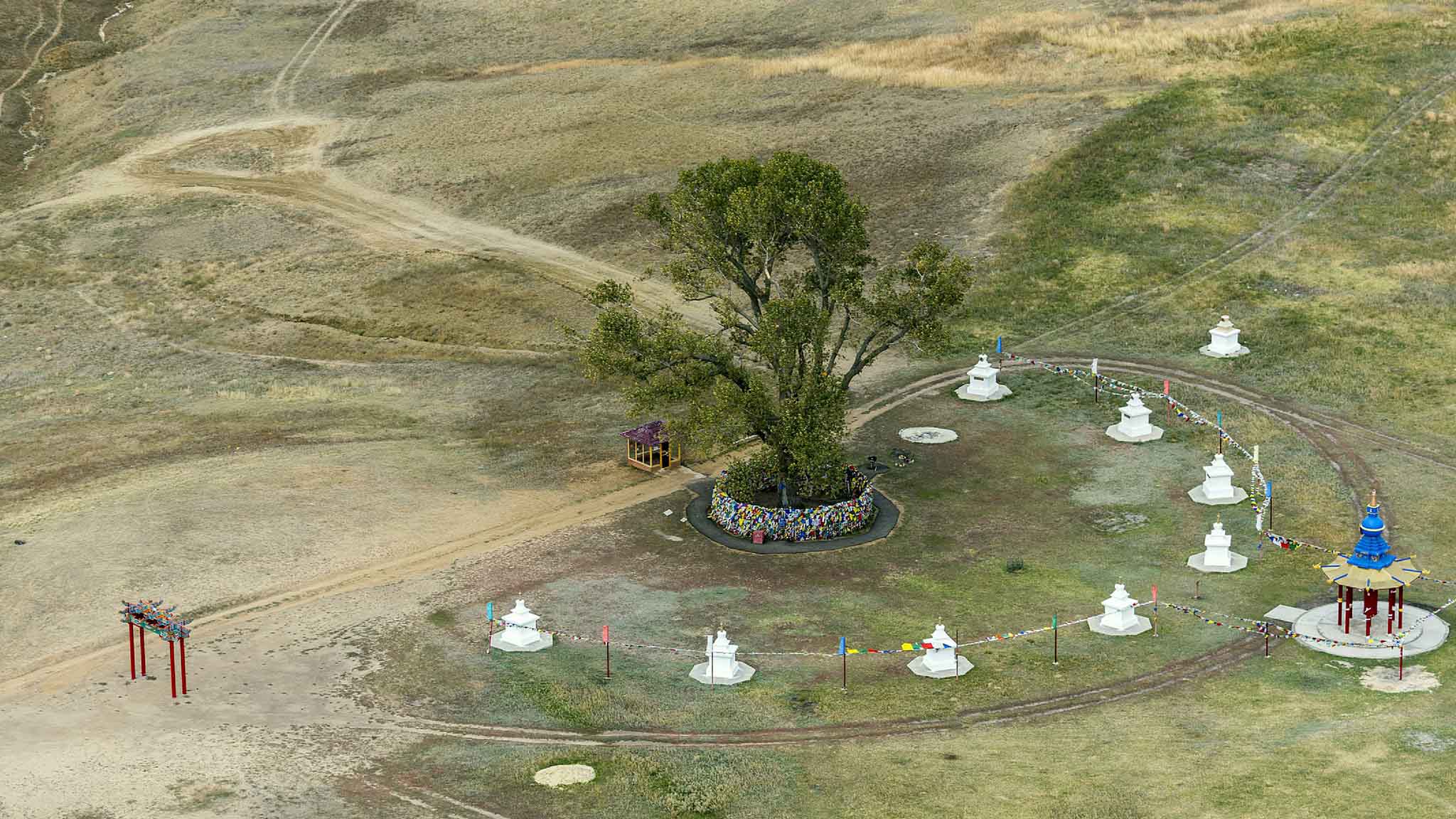 Священное место для буддистов, расположенное в степи. По легенде, тополь был посажен монахом в 1846 году после его путешествия к Далай-Ламе в Тибет. Другая версия гласит о том, что тополь был высажен в конце 1880-х — начале 1890-х годов лесником Элистинской лесной плантации. Дерево настолько велико, что его ствол могут «обнять» несколько человек, взявшись за руки. Вокруг тополя установлены ступы и молитвенный барабан, а рядом бьют целебные источники. Место считается священным для загадывания желаний. В 2019 году Одинокий тополь стал победителем Национального конкурса «Российское дерево года».