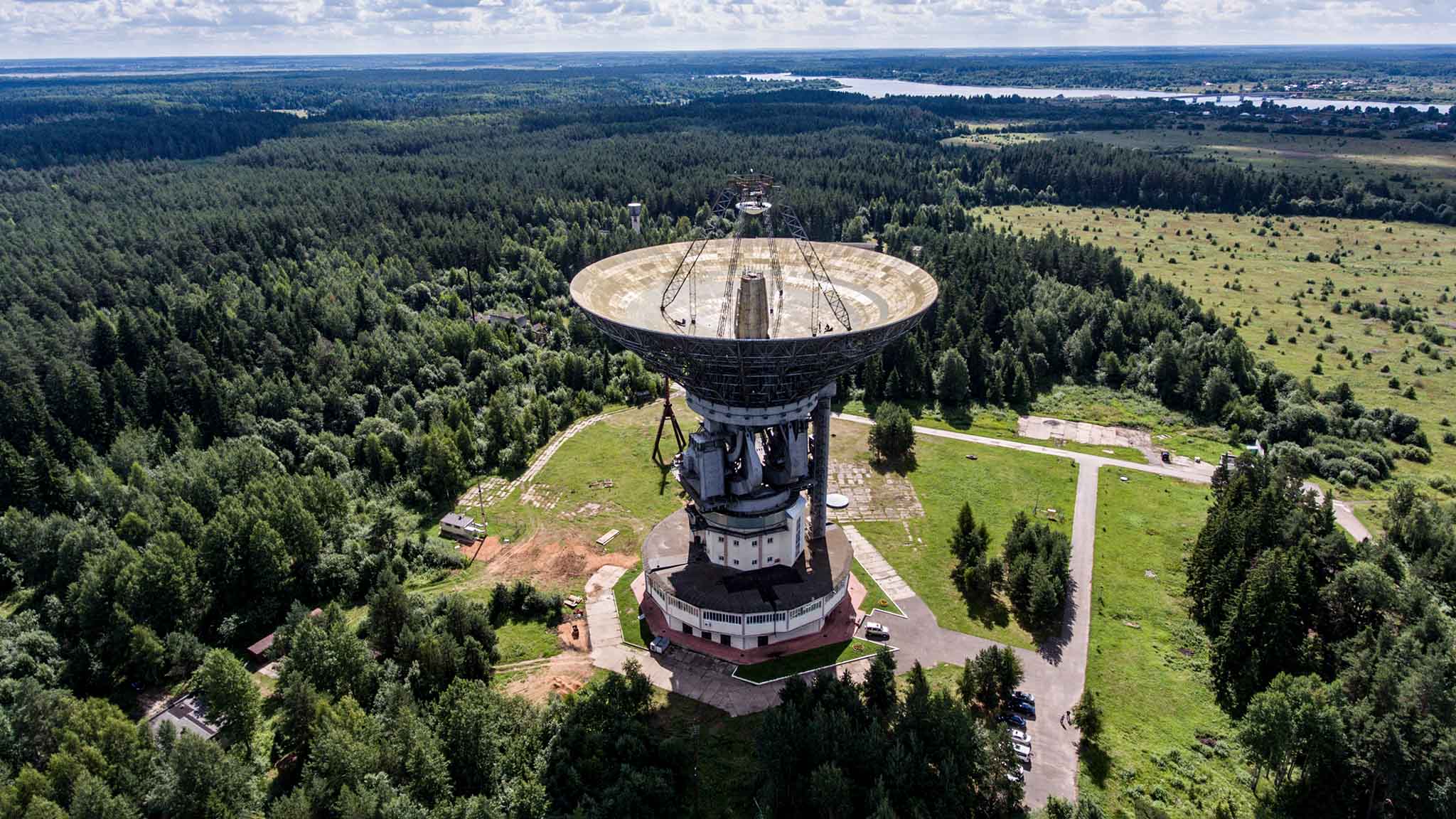 «Калязинское ухо», или Радиоастрономическая обсерватория, которая начала свою работу в 1992 году, от колокольни кажется крохотной тарелкой. На самом же деле диаметр рефлектора — 64 метра (это как 22-этажный круглый дом на ножке). Раз в 4 минуты радиотелескоп делает полный оборот, принимая сигнал. С его помощью ученые исследуют галактику.