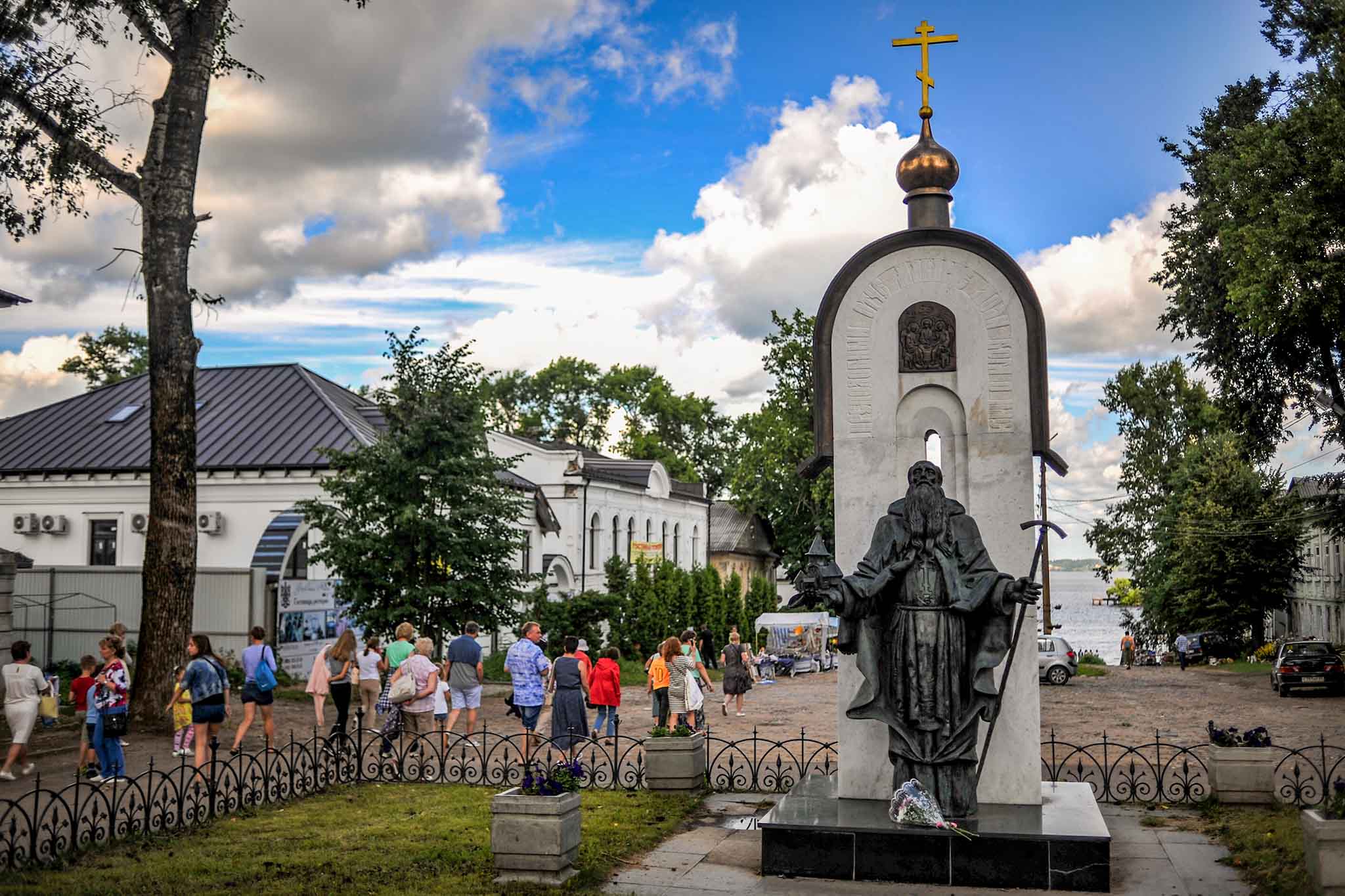 В миру этого человека звали Матвей Кожин. Жил он в XV веке. Овдовев, принял монашество под именем Макарий и основал в Калязине Троицкий монастырь. Пройдет 40 лет с его смерти, монахи вскроют захоронение — и обнаружат, что мощи не истлели! Они хранятся в храме Вознесения неподалеку. А Макарий Калязинский почитается как святой и покровитель города. Памятник, поставленный тут в 2008 году, изображает святого с макетом храма в правой руке. В левой у него — посох. А позади — Угличское водохранилище, которое скрыло под водой его обитель…