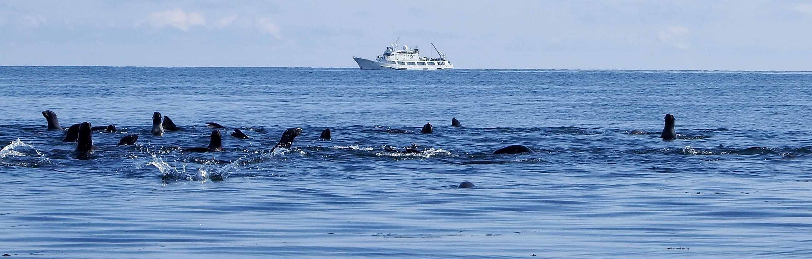 На автомобиле повышенной проходимости можно добраться до мыса Юшина, возле которого находится лежбище морских котиков. Путь лежит у побережья океана. Вдоль лежбища тянется длинная эстакада. С нее — с очень близкого расстояния — наблюдают за жизнью сивучей и морских котиков. Это вам не зоопарк — можно увидеть как умильную сцену с выводком детенышей, так и жестокую драку самцов. Дикая природа без прикрас.