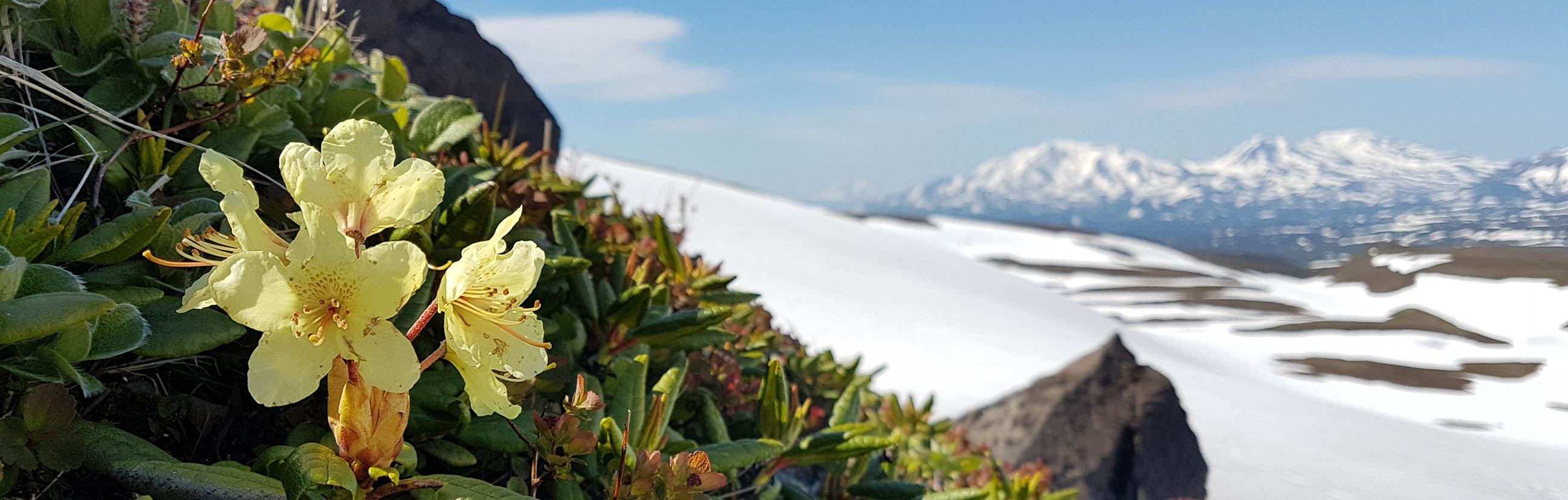 Еще одна природная достопримечательность заповедника с тысячелетней историей. Крупный горный массив из внушительных снежников и 46 ледников, образованных на вулканах. Льды здесь не тают даже летом. На стыке ледников и открытой почвы можно увидеть уникальную камчатскую растительность.