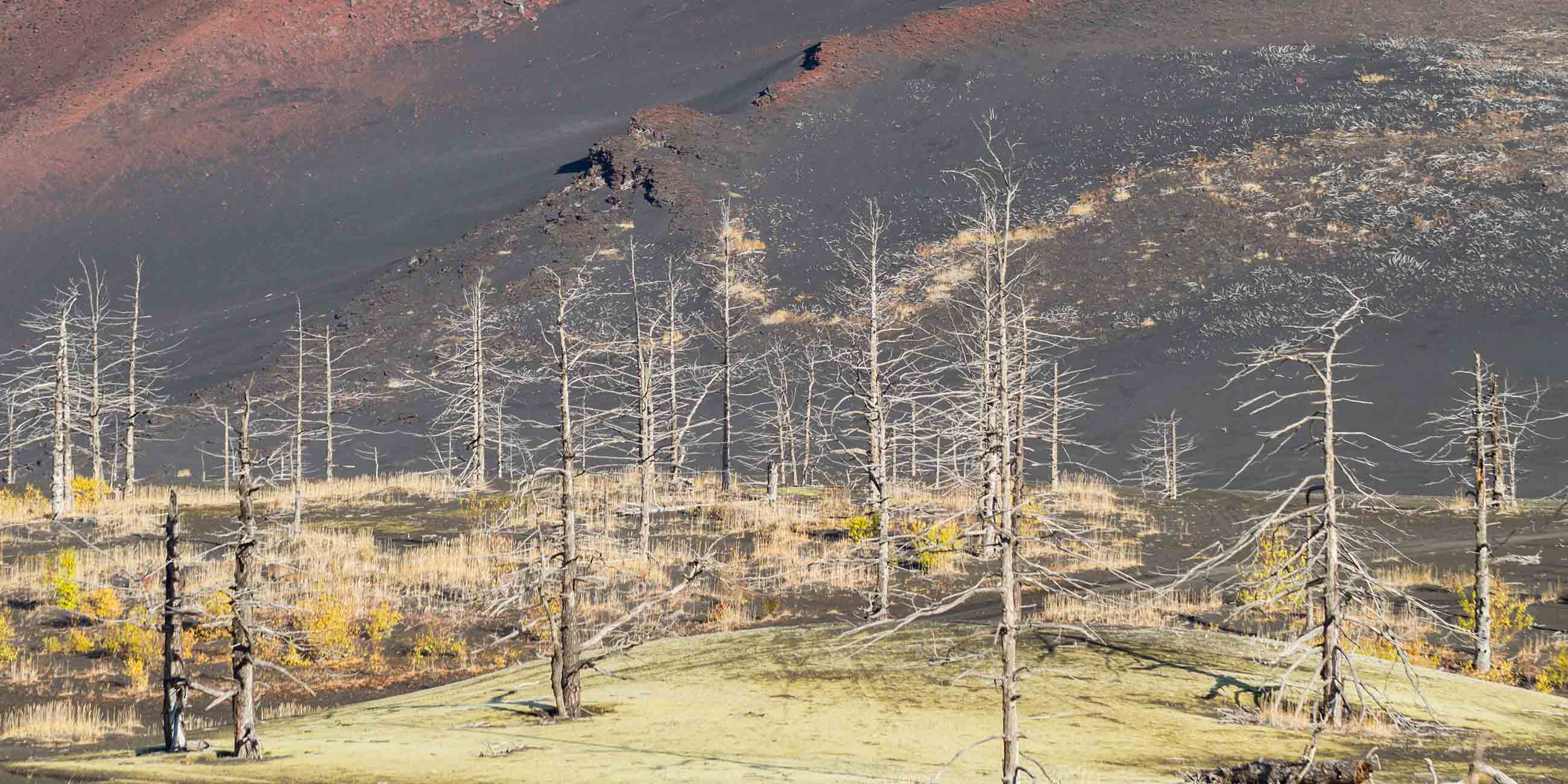 Здесь и знаменитая Ключевская Сопка — самый высокий вулкан континента, и чуть менее внушительные, но более разрушительные вулканы Толбачики, один из которых действующий. У их подножья и расположен Мертвый лес — следствие крупнейшего извержения 1975 года.