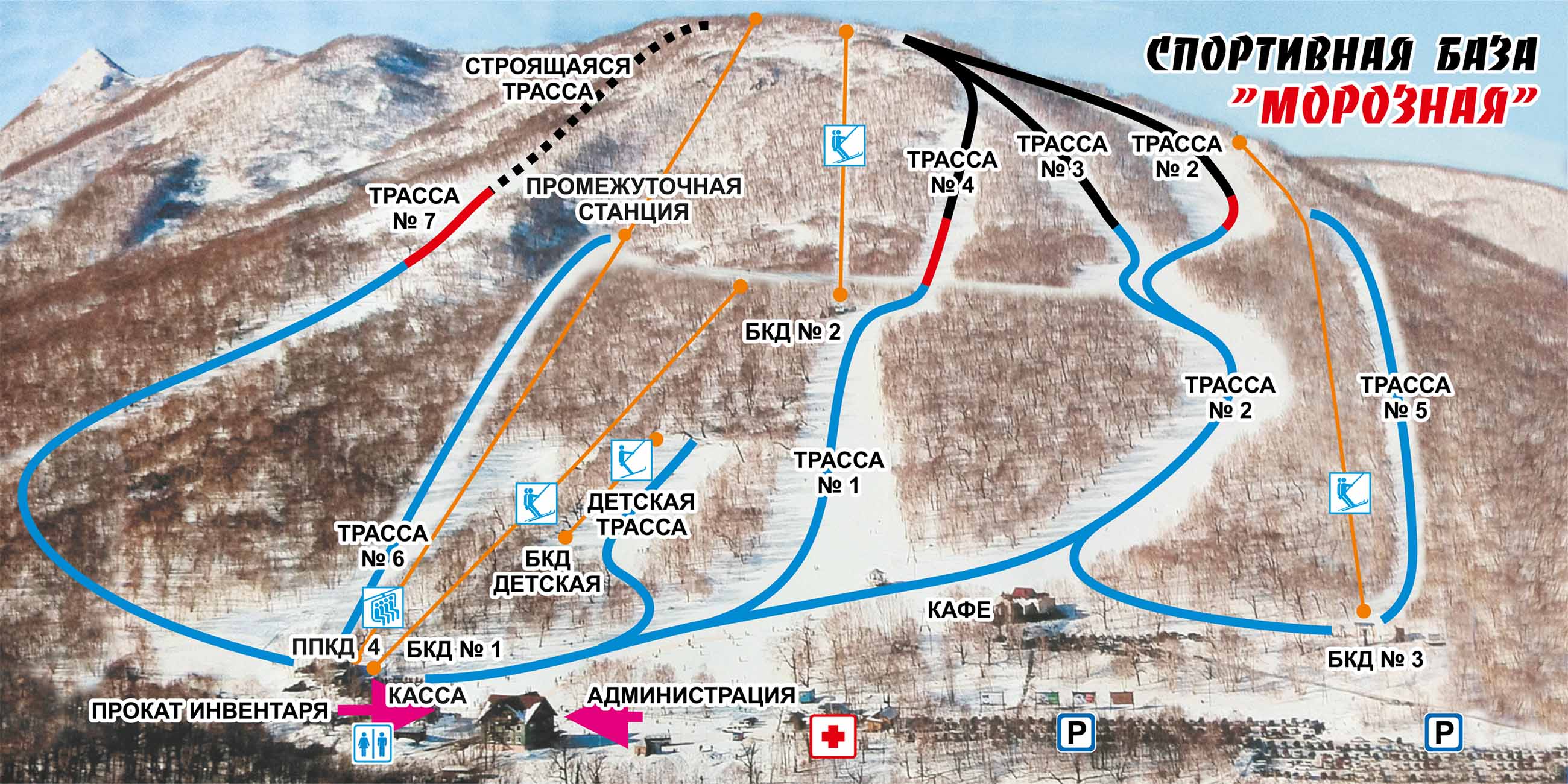 «Морозная» располагает семью трассами различного уровня сложности: синими, красными и черными, предназначенными для скоростного спуска, супер-гиганта, слалома-гиганта, слалома. Есть также детская учебная трасса.