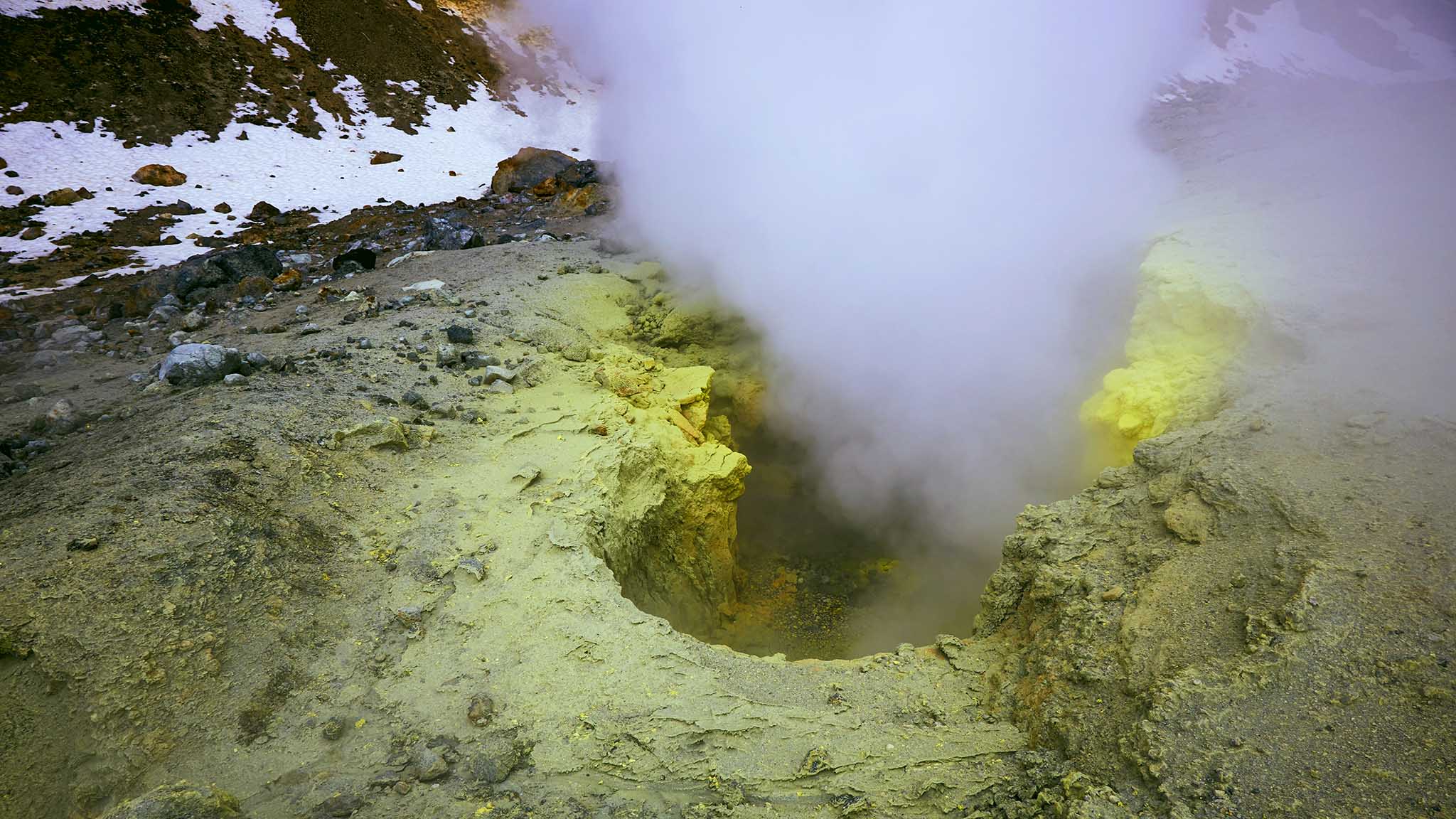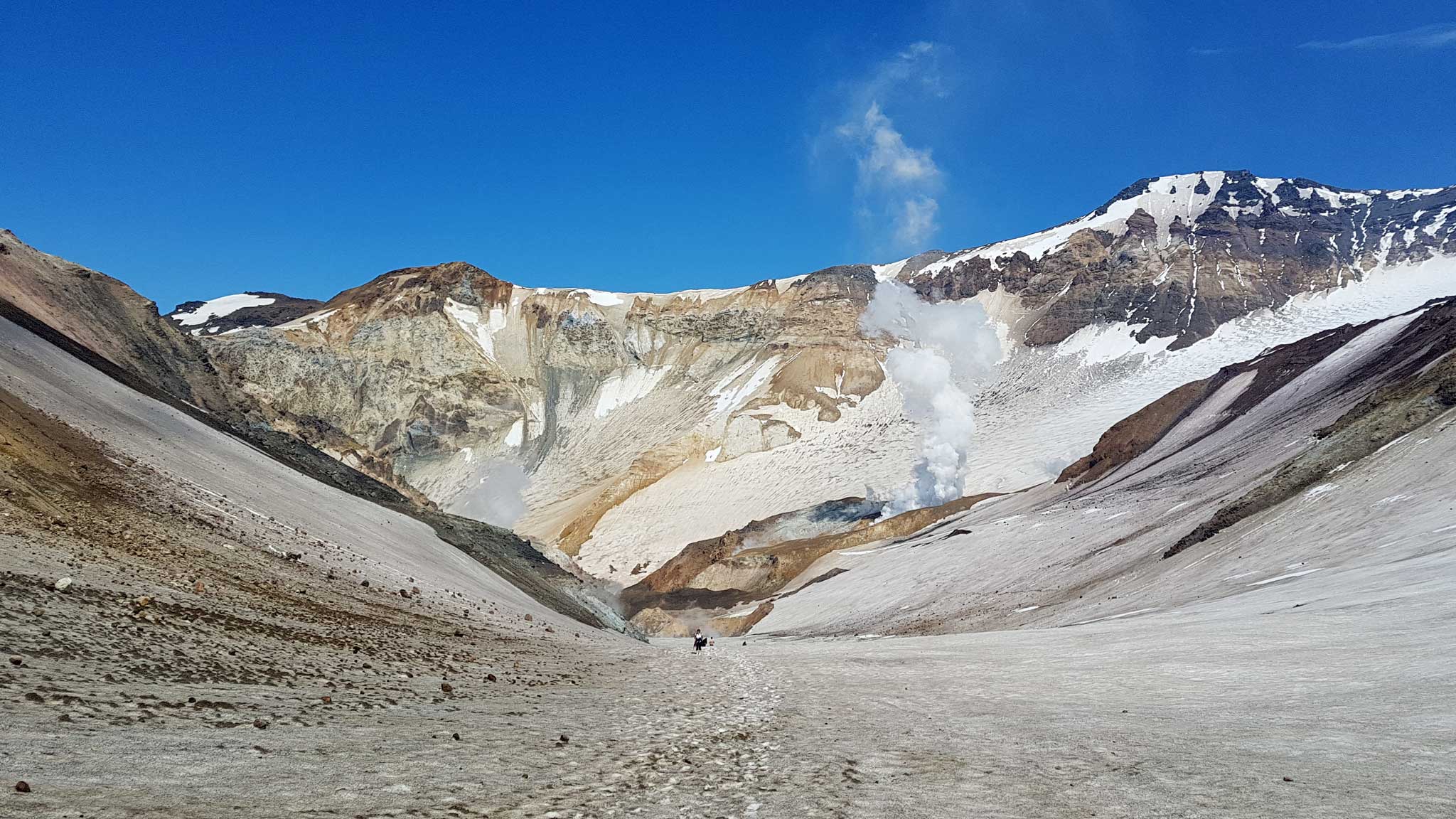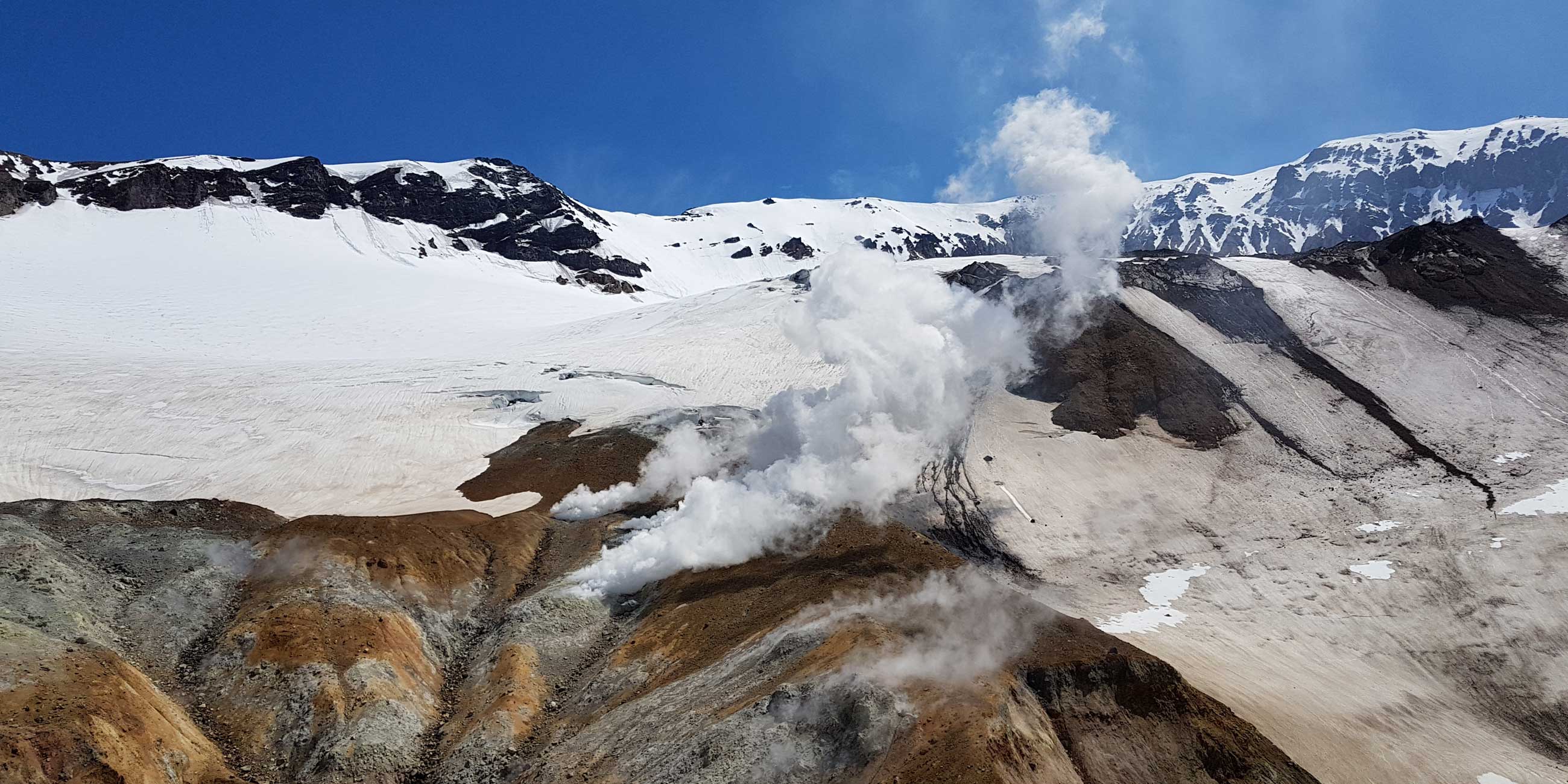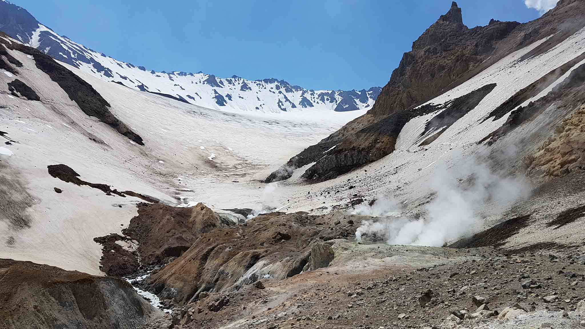 Хотя заставить себя быстро уйти от этого места трудно, котлы на дне воронки с кипящей грязью и струями пара завораживают. Как и образовавшийся на стенках кратера колоссальный ледник, который медленно сползает на раскаленное дно. Вот где можно встретить настоящую песнь льда и пламени.