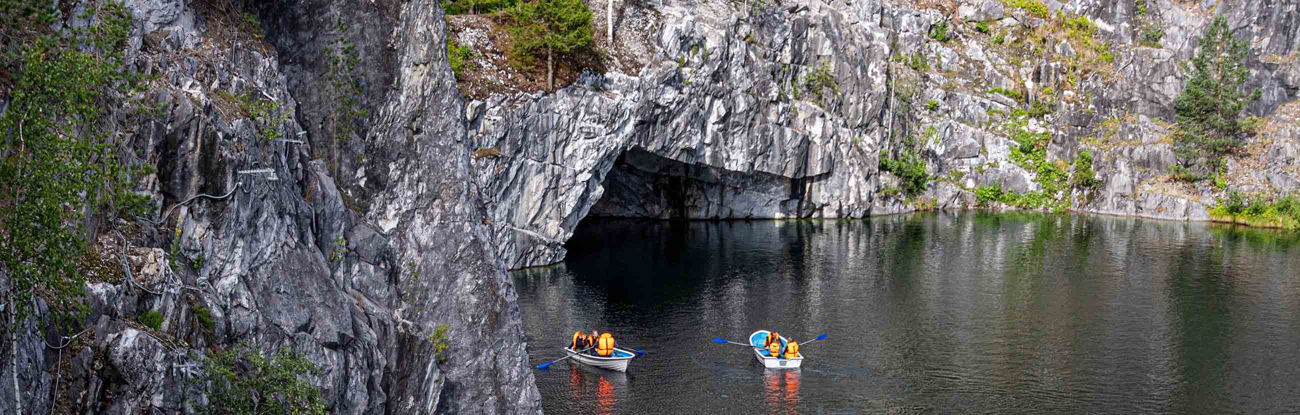 Как вам идея прокатиться на зиплайне над старинным мраморным карьером? Такая возможность есть в горном парке «Рускеала». Здесь вы увидите красивые озера, водопады и пещеры. Одна из главных достопримечательностей Мраморный каньон — огромный котлован, заполненный водой изумрудного цвета. Любители экстрима могут почувствовать свободу и радость полета, попробовав банджи-джампинг. Если боитесь прыгать в обрыв с веревкой, можно рассмотреть водные развлечения — байдарки и SUP-борды.