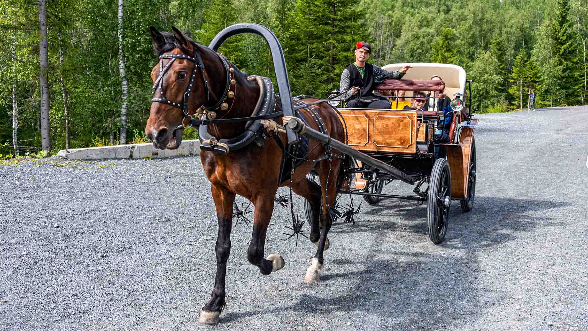 Если вы прибываете в горный парк на ретропоезде «Рускеальский экспресс», не пропустите завораживающее зрелище: разворот паровоза на поворотном круге. Это огромная металлическая ферма, которая разворачивает на станции локомотив на 180 градусов. Раньше такие конструкции были распространены, а сейчас это самый настоящий аттракцион для туристов. После — отправляйтесь в горный парк. Вы можете подняться на конной повозке (за дополнительную плату) или пешком.