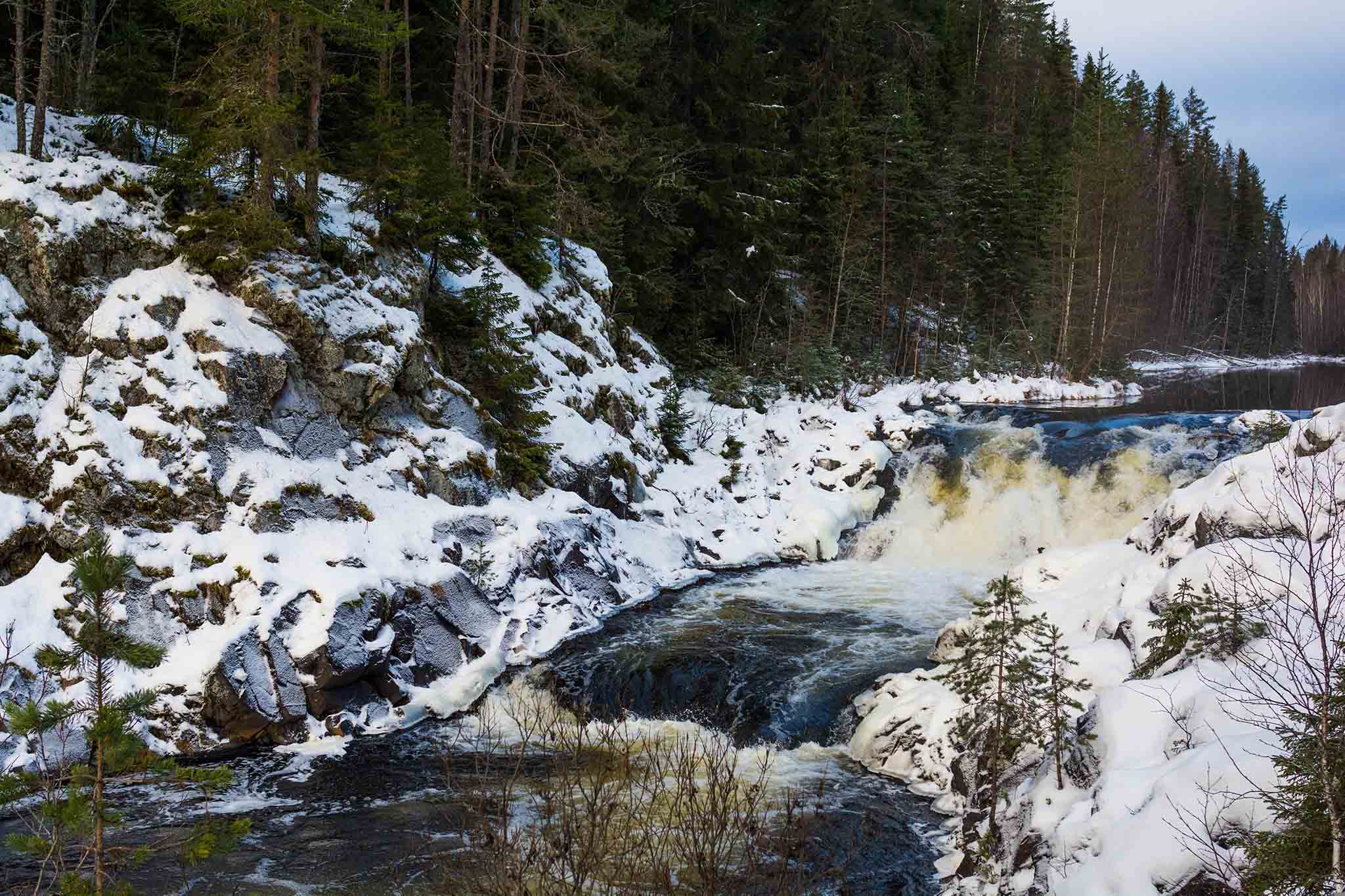 В холодное время года Кивач не замерзает. Река несется между заснеженных берегов, и вода с шумом скатывается с обледеневших скал. Зимой, особенно во время снегопадов, тропинки и спуски к реке бывают скользкими, поэтому нужно быть осторожными.