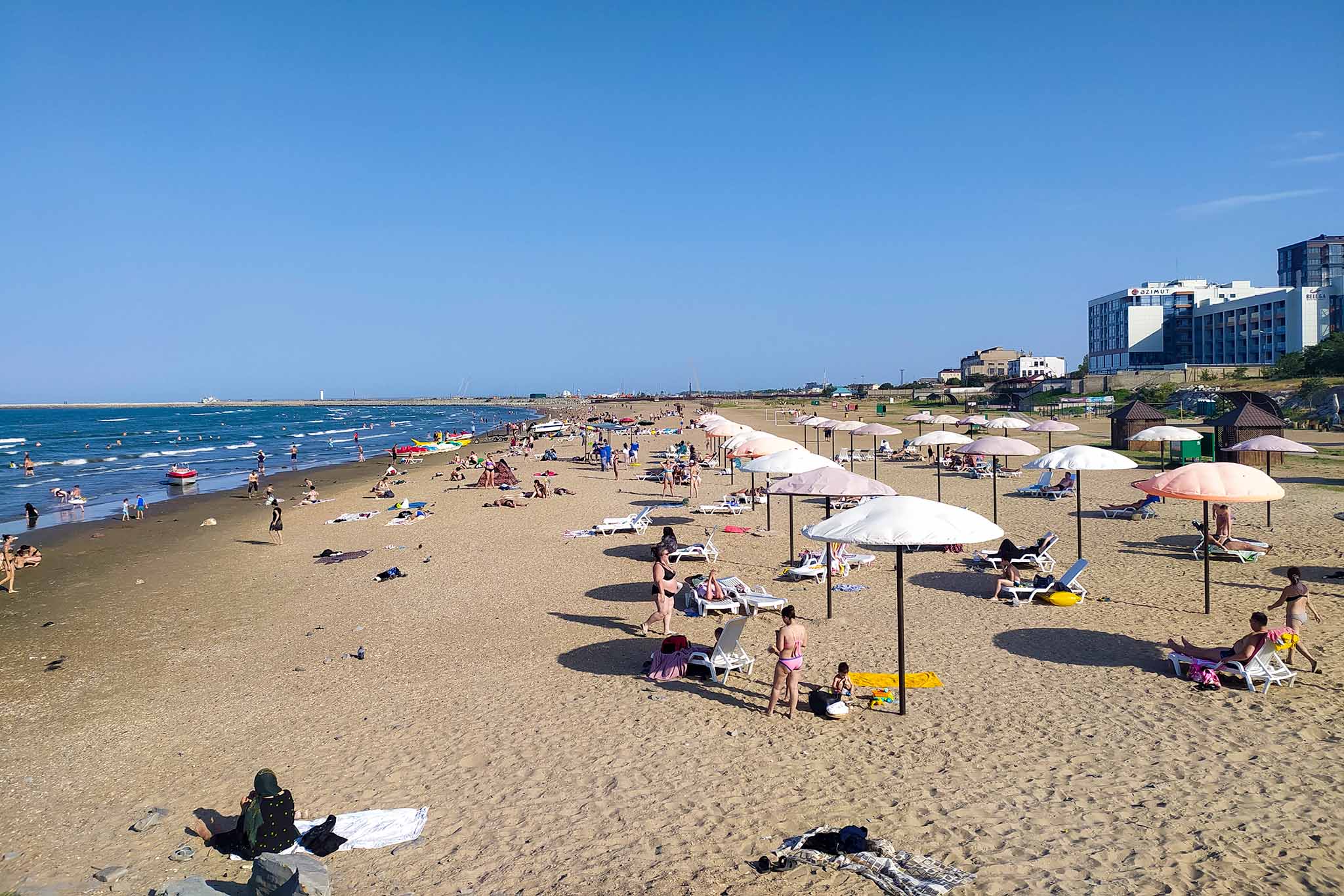 Городской пляж Каспийска радует мелким песком и отсутствием большого скопления людей. Даже в пик туристического сезона на берегу моря не бывает столько отдыхающих, как на черноморских курортах Краснодарского края.