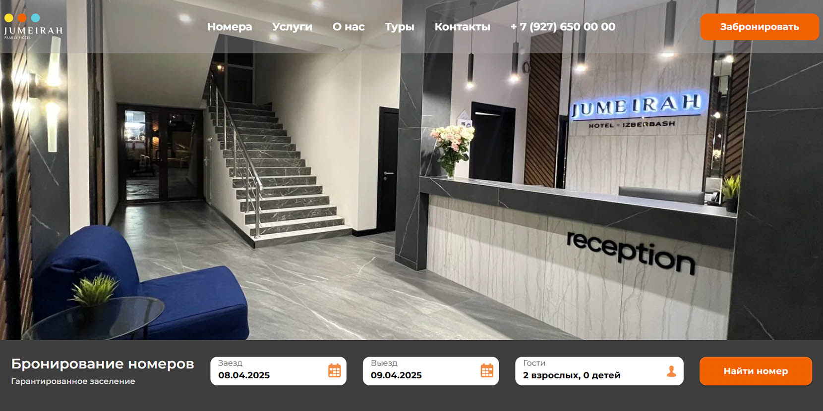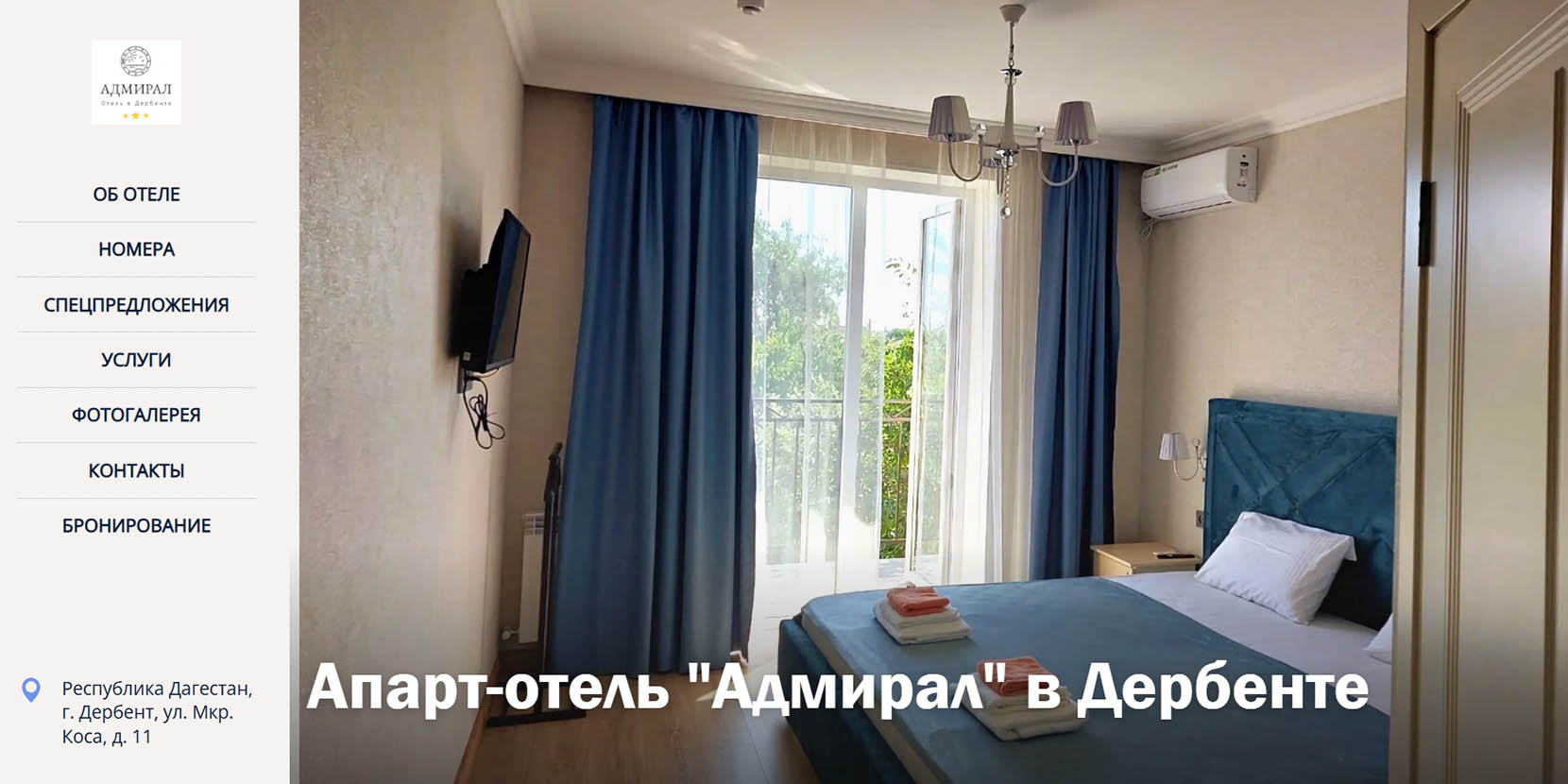 Гостиница удачно расположена в центре Дербента, в 50 метрах от песчаного пляжа, имеет собственный выход на него. Отсюда легко добраться до главных достопримечательностей города, например, до цитадели Нарын-кала всего 2,5 км. На территории отеля есть два ресторана, парковка и Wi-Fi, библиотека, прачечная. В четырех корпусах размещены 49 номеров — от стандартов и трехкомнатных апартаментов.