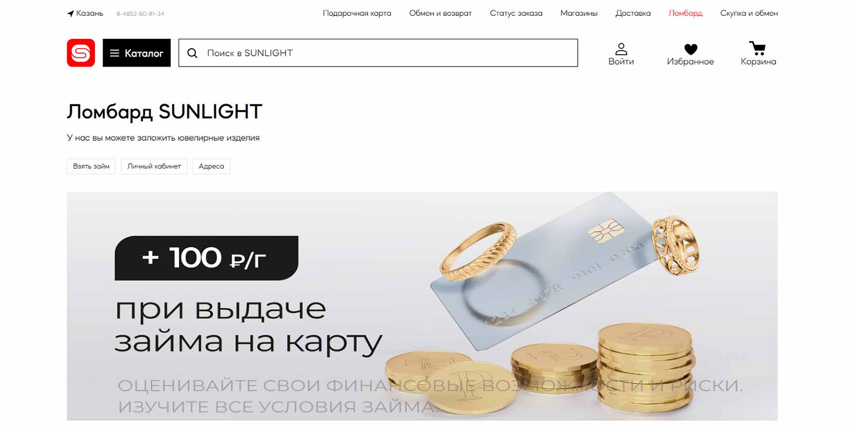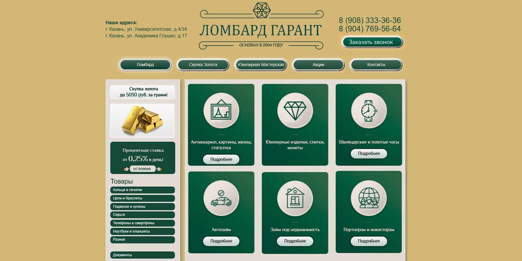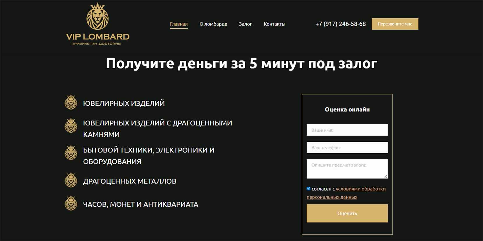 Многопрофильный ломбард, где можно продать ювелирные изделия, слитки и монеты, антиквариат, картины, статуэтки, швейцарские и золотые часы. Также присутствует возможность автозайма под залог машин отечественных и зарубежных марок. Доступно общение через мессенджеры. Есть льготы по процентам для ряда категорий граждан, периодически проводятся акции.