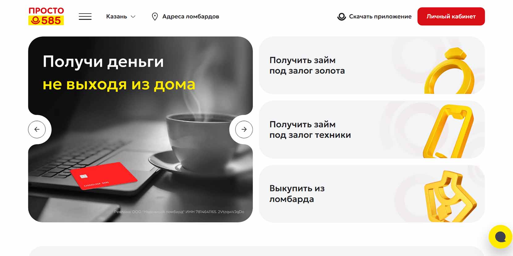 Федеральная сеть ломбардов, работающая с 2000 года и насчитывающая более 400 точек по всей стране. Выдают займы под залог золота (допускаются украшения с прозрачными бриллиантами) и техники. Возможен предварительный расчёт стоимости не только ювелирного изделия, но и техники на основании модели и фото. Программа лояльности и льготы зависят от кредитной истории и предшествующих взаимодействий с клиентом.