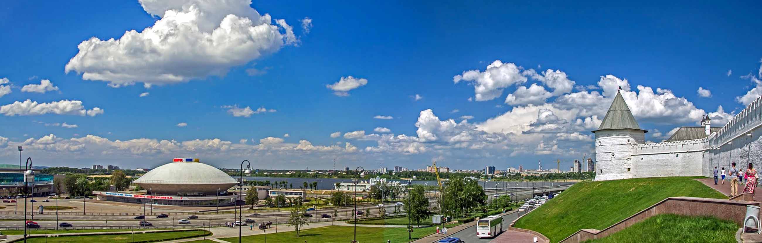 Отличные панорамные фотографии всей площади Тысячелетия Казани получаются от Безымянной башни Казанского кремля и со смотровой площадки в башне за мечетью Кул-Шариф.
