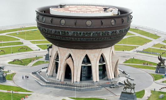 Центр семьи чаще называют «Чашей». Именно такую форму имеет традиционный татарский казан, или котел — символ домашнего очага. Да и само здание по задумке представляет из себя огромную посудину, которая стоит на огне. По основанию здания сделаны арки в виде языков пламени.