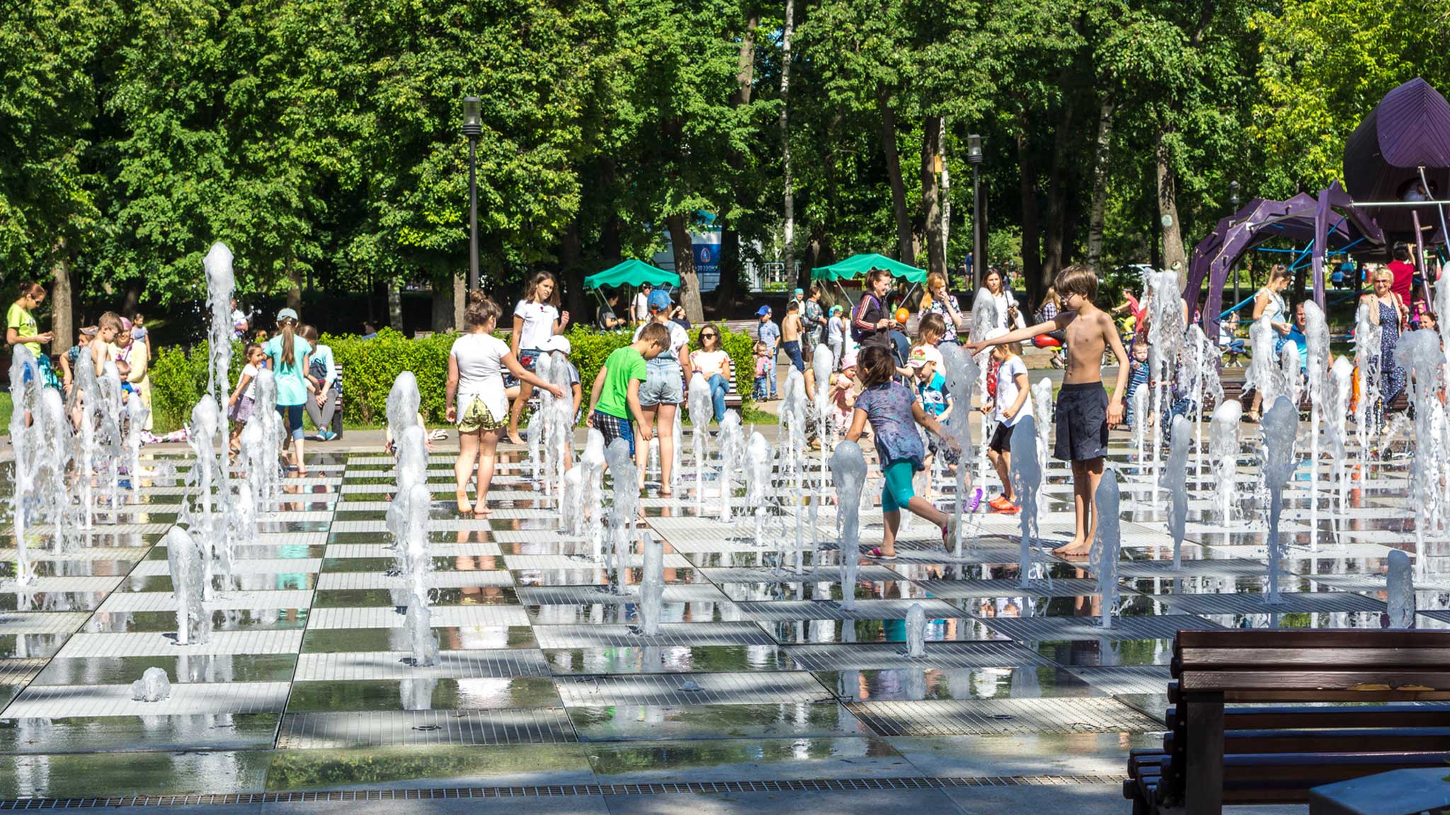 Летом все собираются у главного фонтана, который сделан в виде шахматной доски. Днем дети бегают под струями воды, которые поднимаются на разную высоту. А вечером фонтан переливается разными красками и “танцует” в такт музыки. Посмотреть на это любят как сами горожане, так и туристы.