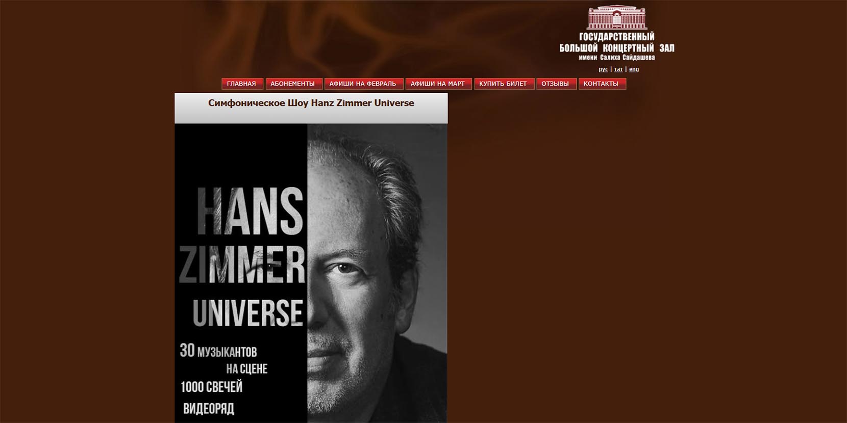 Ханс Циммер — немецкий композитор, пишущий музыку к фильмам и компьютерным играм. «Человек дождя», «Перл-Харбор», «Начало», «Интерстеллар», «Король Лев», «Спирит: душа прерий» — это лишь малая часть фильмов и мультфильмов, саундтреки к которым созданы Хансом Циммером. Гости шоу смогут послушать знаменитую на весь мир музыку в исполнении симфонического оркестра. Атмосферности концерту добавит мягкий свет тысячи свечей и специально подобранный видеоряд.