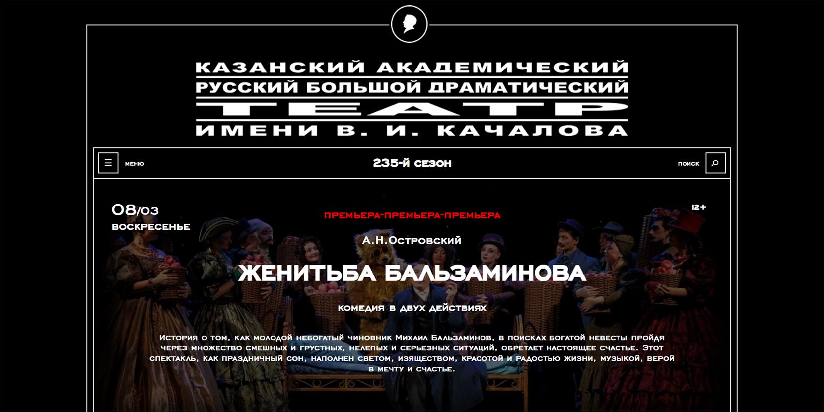 Комедия в двух действиях по пьесе Островского о поисках богатой невесты отнюдь не богатым чиновником. Иллюзорность стремления к красивой жизни выливается во множество одновременно и грустных, и смешных, и нелепых ситуаций. Режиссер-постановщик спектакля – Заслуженный артист России, народный артист Татарстана, лауреат Национальной театральной премии «Золотая маска» Илья Славутский.