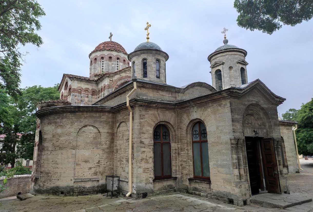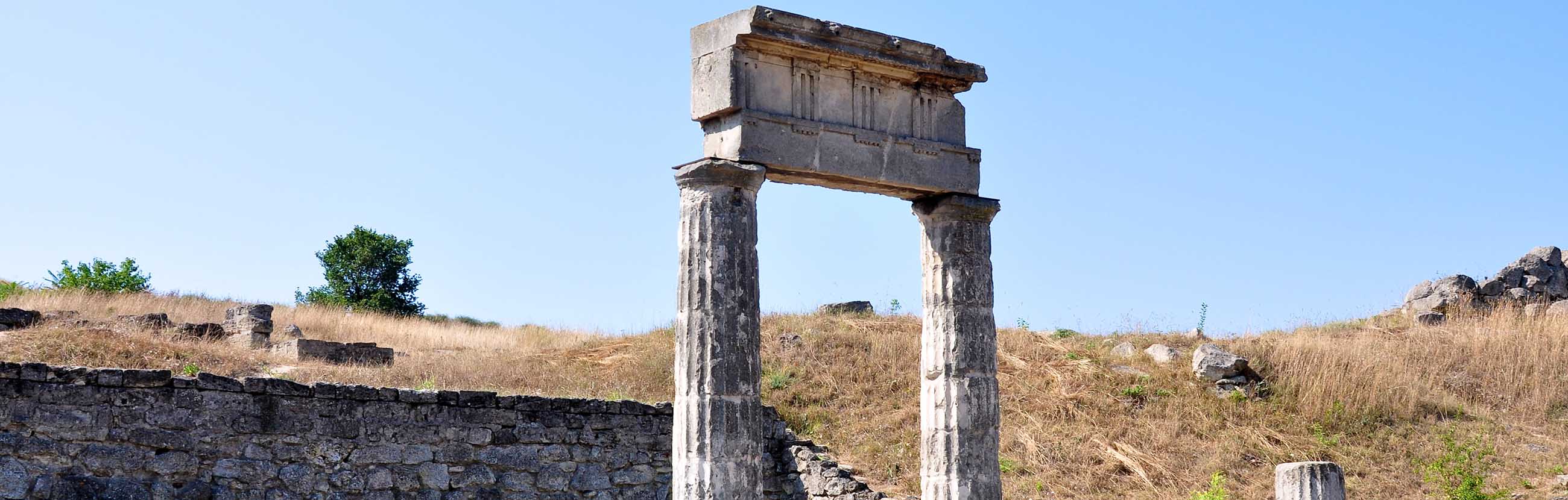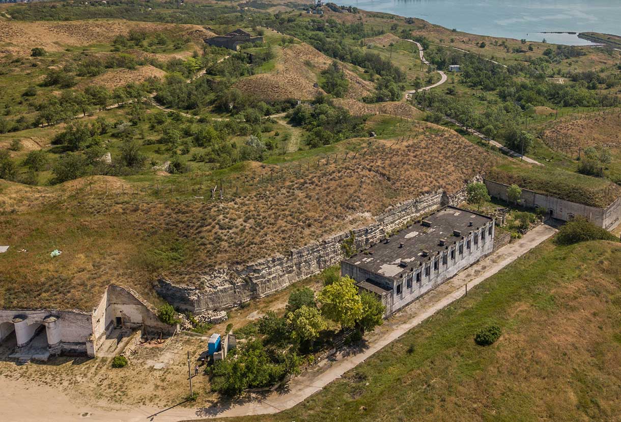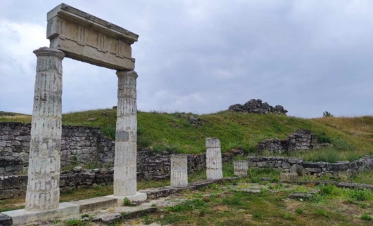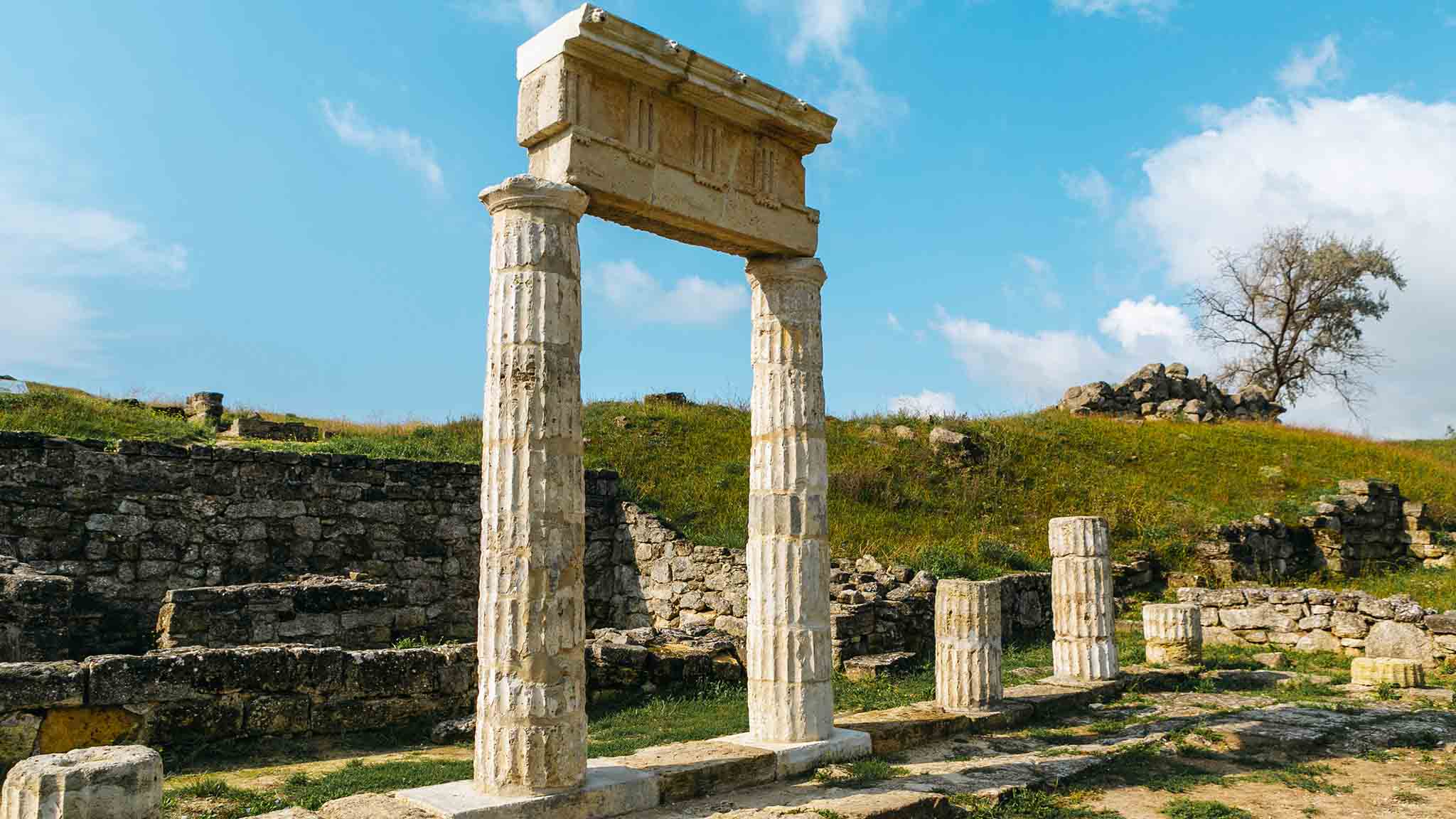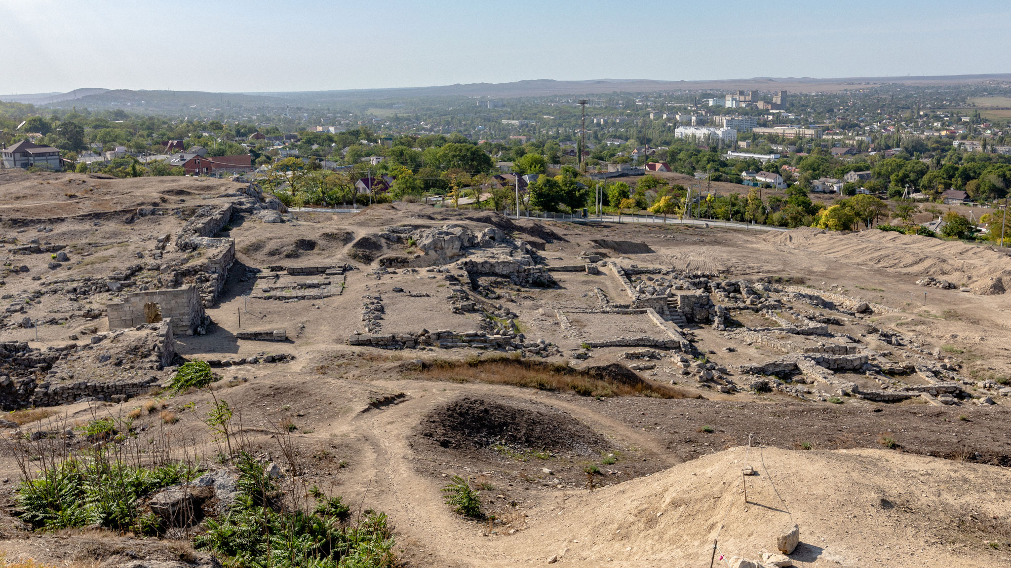Одна из самых эффектных сохранившихся построек Пантикапея — колоннада, а также остатки здания с арочным проемом, сквозь который видна часть города — на фото это выглядит очень интересно.