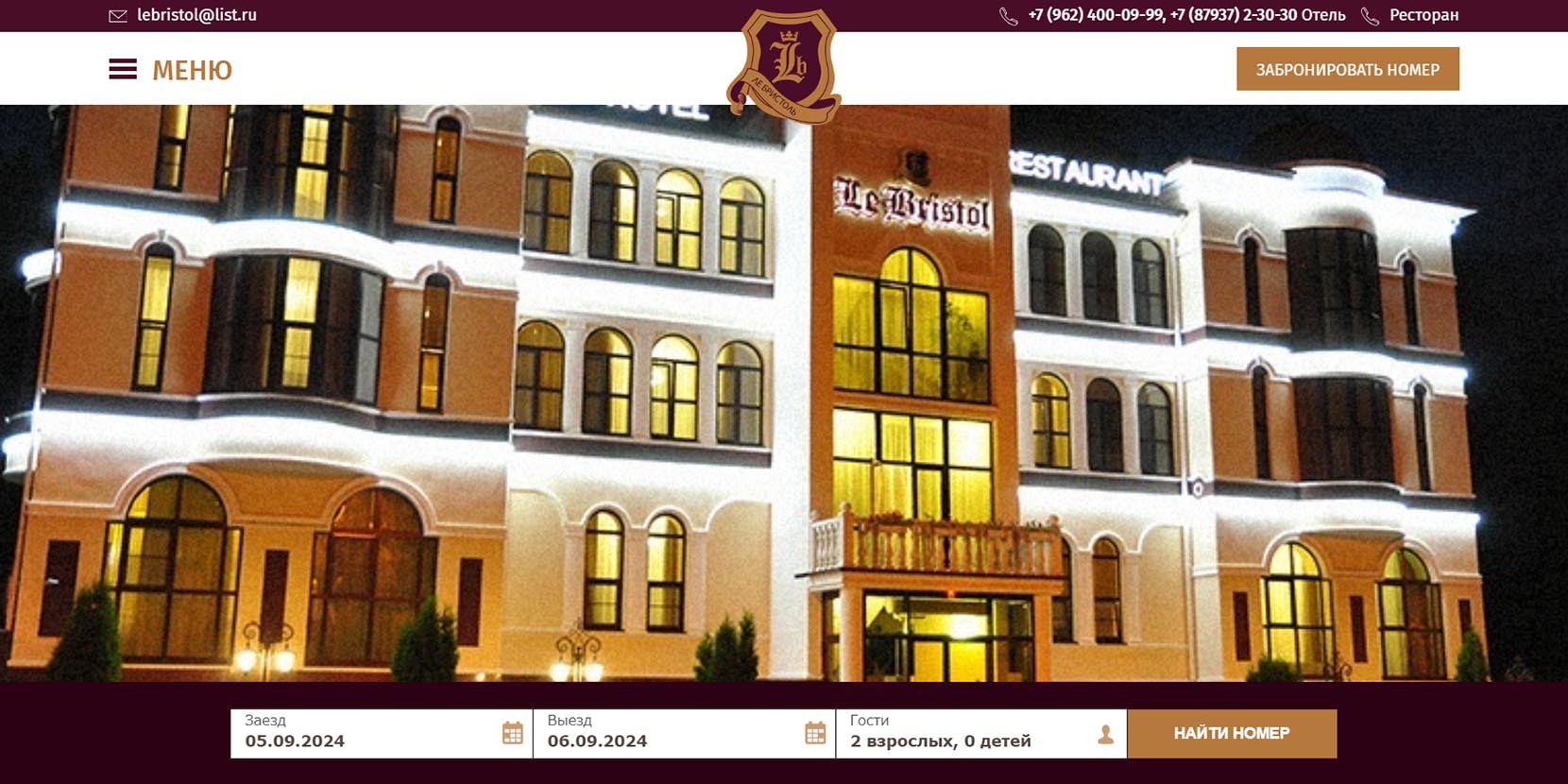 Гостиница расположена в начале главного пешеходного бульвара курорта, в шаговой доступности от основных достопримечательностей. Номерной фонд представлен однокомнатными и двухкомнатными номерами категорий стандарт и люкс. Завтрак включен в стоимость проживания, на выбор для предварительного заказа представлены около 10 его вариаций. Припарковать машину возле отеля негде, поскольку проезд на Курортный бульвар запрещен. Есть автостоянка в двух минутах ходьбы.