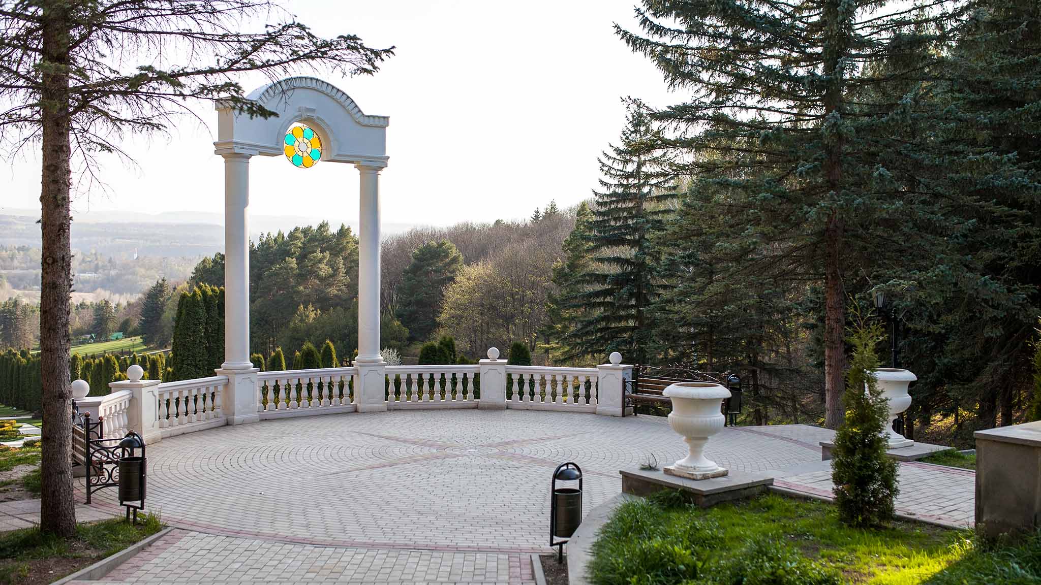 В Долине роз популярна смотровая площадка на возвышенности, куда ведет аллея туй. Поднявшись по ступеням с вазонами, вы окажетесь на полукруглой площадке с воздушной белой беседкой в классическом стиле. Красивый вид на Эльбрус открывается из беседки «Семь ветров». Ротонда стоит на высоте 1130 метров.