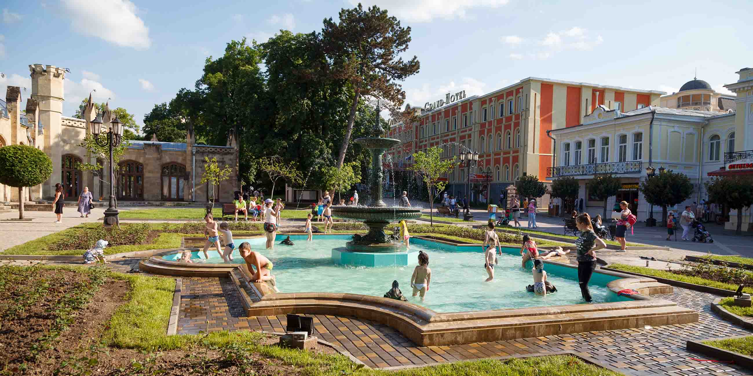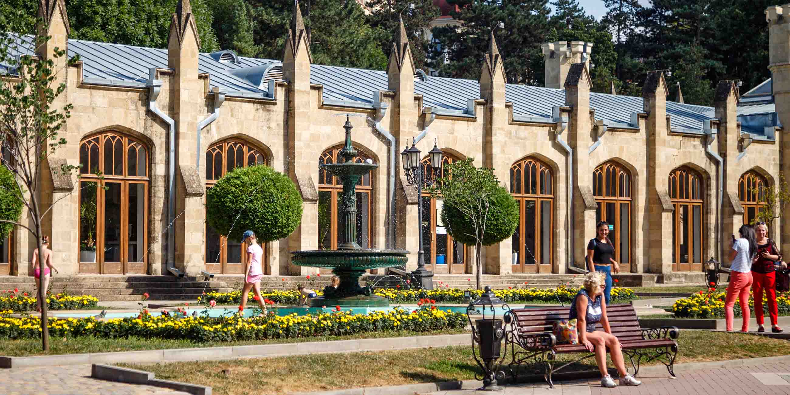 Затем идите гулять в сад рядом с Нарзанной галереей. Если вы отдыхаете летом, освежитесь у фонтана с чашей по центру и бронзовыми лягушками в углах бассейна. Можно даже пройтись по нему, бассейн неглубокий. Курортники обычно загадывают там желание: бросьте в чашу монетку или потрите спинку одной из лягушек.
