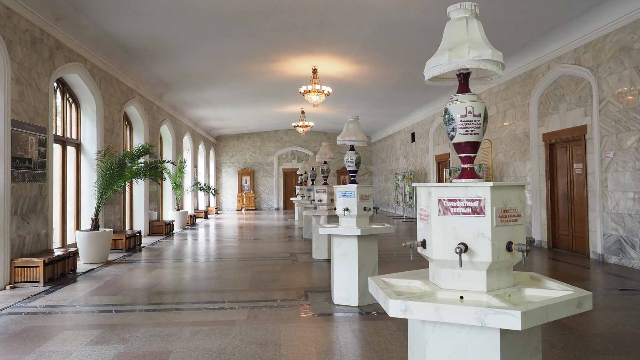Войти в Нарзанную галерею можно бесплатно. Наполнив свою бюветницу вкусным нарзаном, походите по галерее. Сфотографируйте статуи и внимательно посмотрите на светильники над бюветами с достопримечательностями Кисловодска. На лампах изображены Главные нарзанные ванны, Колоннада над входом в Кисловодский парк, Зеркальный пруд, мостик «Дамский каприз», Свято-Никольский собор и памятник Лермонтову.